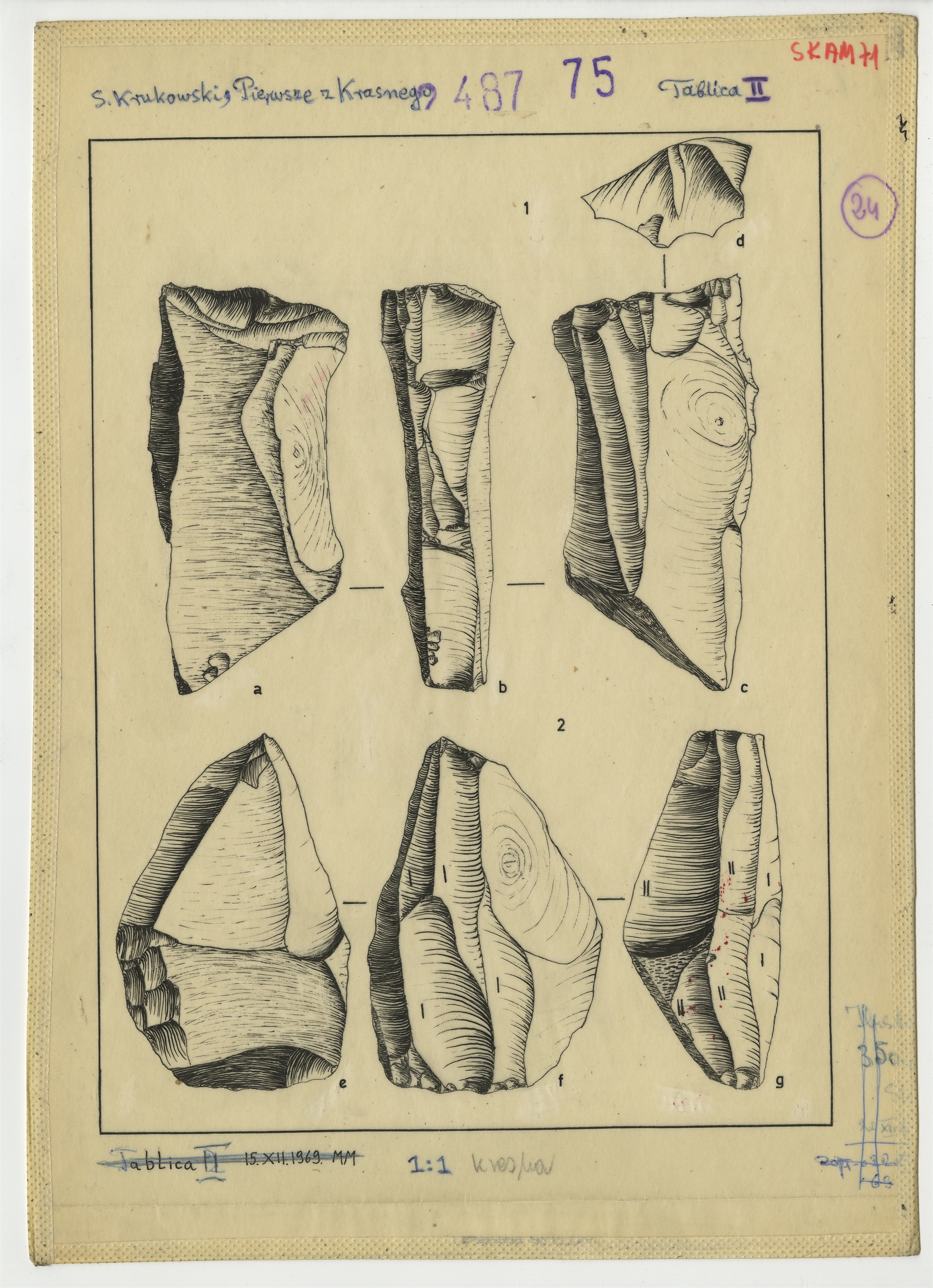 Ilustracje do "Skama 71" - Tablica II z rysunkami krzemieni tuszem na kalce zatytułowana: S. Krukowski "Pierwsze z Krasnego"