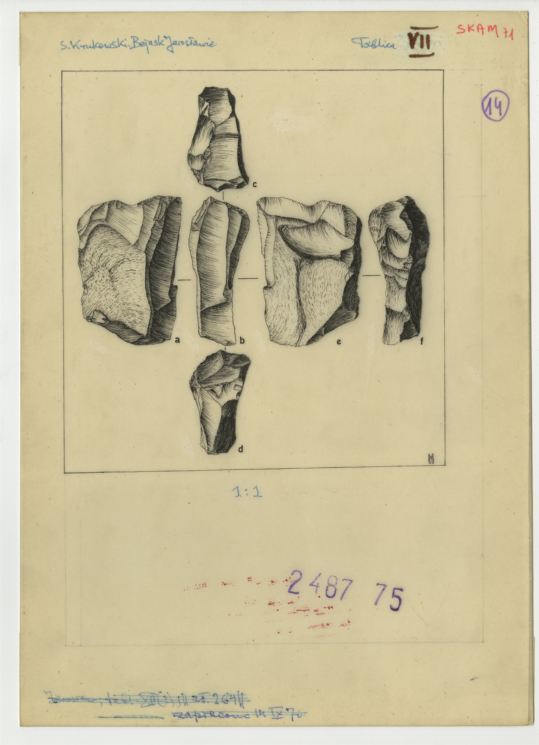 Ilustracje do "Skama 71" - Tablica VII z rysunkami krzemieni tuszem na kalce zatytułowana: S. Krukowski "Bejask Jarosławie"