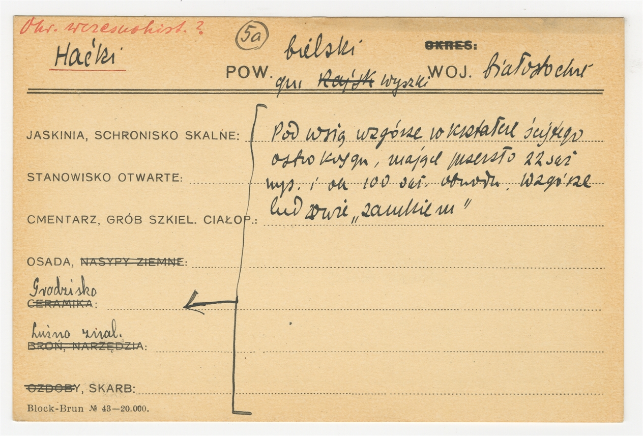Karta stanowiska "Haćki gm. Wyszki pow. bielski woj. Białostockie" (druk rękopis) - strona 1