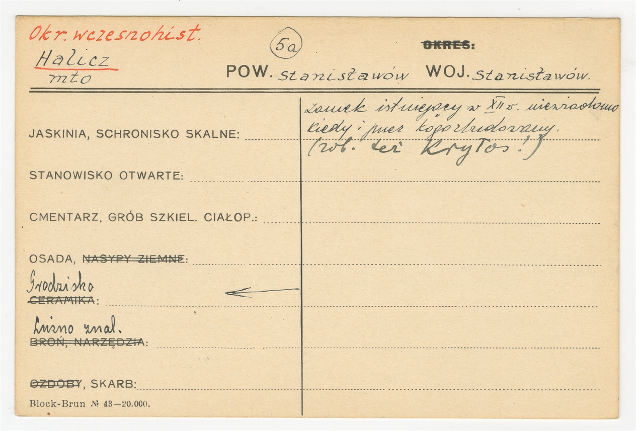 Element 1 - Karta stanowiska "Halicz mto pow. Stanisławów woj. Stanisławów" (druk rękopis) - strona 1