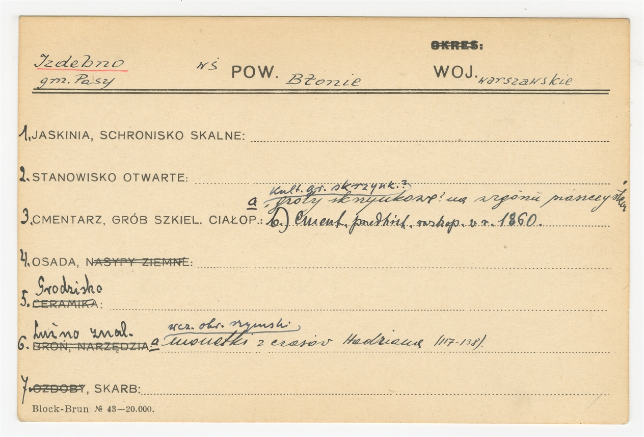 Karta stanowiska "Izdebno gm. Pasy pow. Błonie woj. warszawskie" (druk rękopis) - strona 1