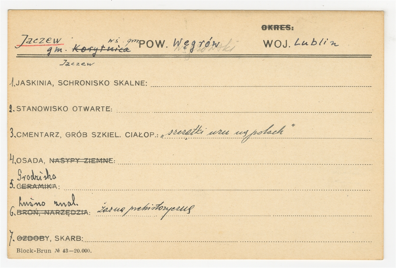 Karta stanowiska "Jaczew gm. Jaczew pow. Węgrów woj. Lublin" (druk rękopis) - strona 1