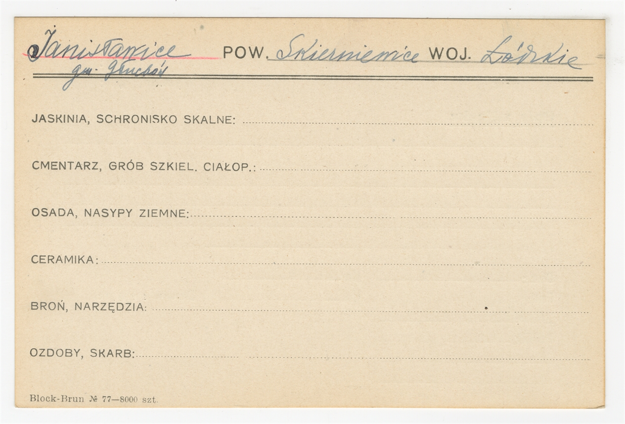 Karta stanowiska "Janisławice gm. Głuchów pow. Skierniewice woj. Łódzkie" (druk rękopis) - strona 1