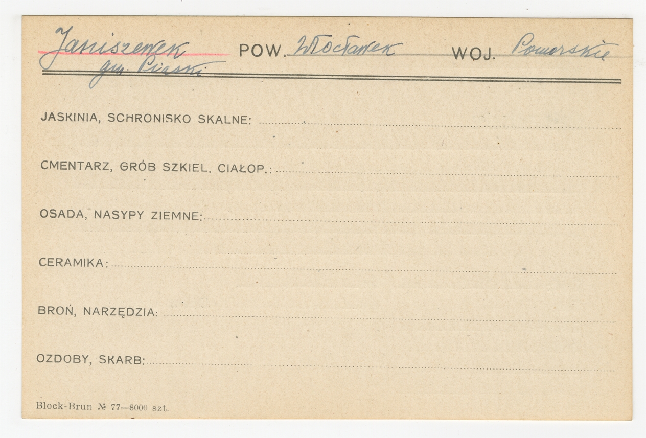 Karta stanowiska "Janiszewek gm. Piaski pow. Włocławek woj. Pomorskie" (druk rękopis) - strona 1
