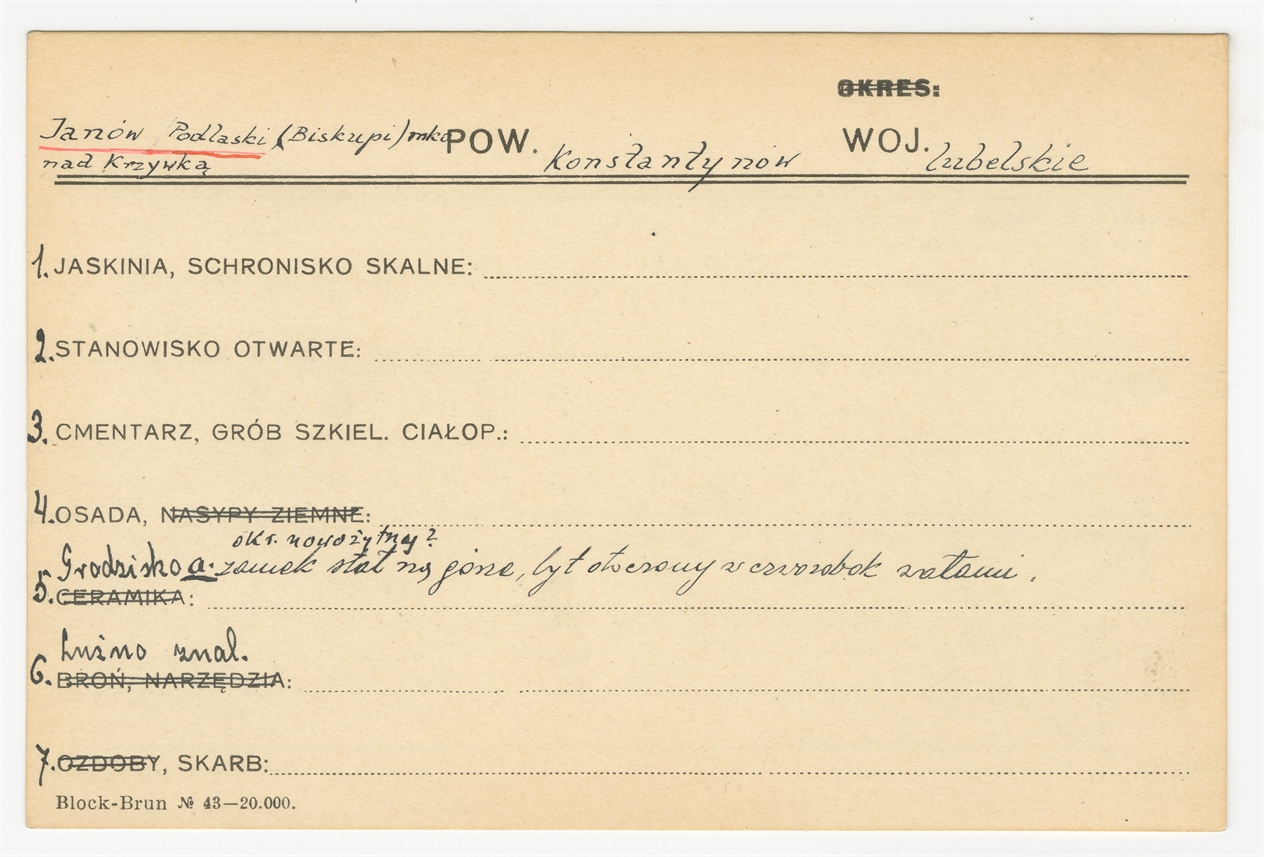 Karta stanowiska "Janów Podlaski (Biskupi) nad Krzywką pow. Konstantynów woj. lubelskie" (druk rękopis) - strona 1