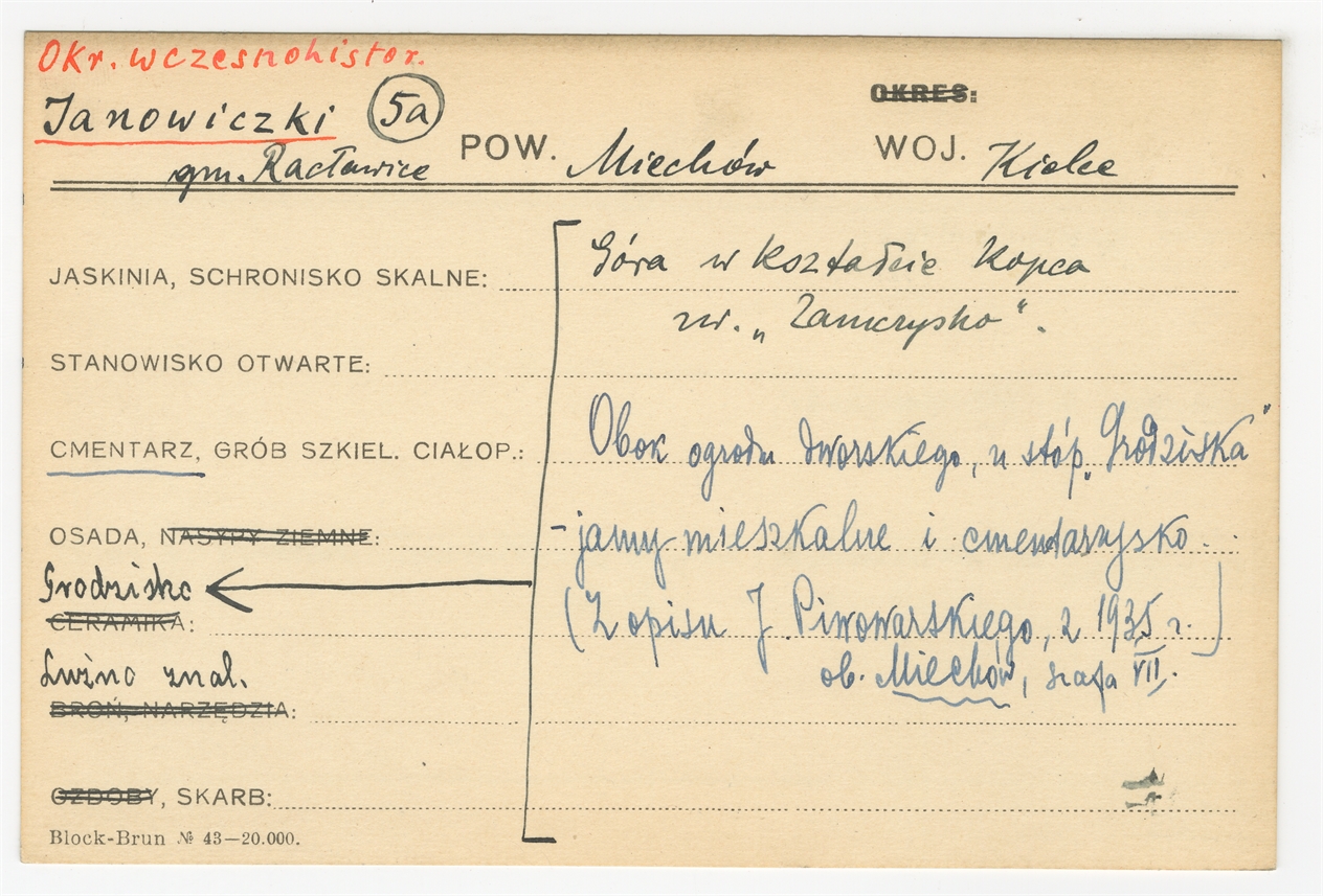 Karta stanowiska "Janowiczki gm. Racławice pow. Miechów woj. Kielce" (druk rękopis) - strona 1