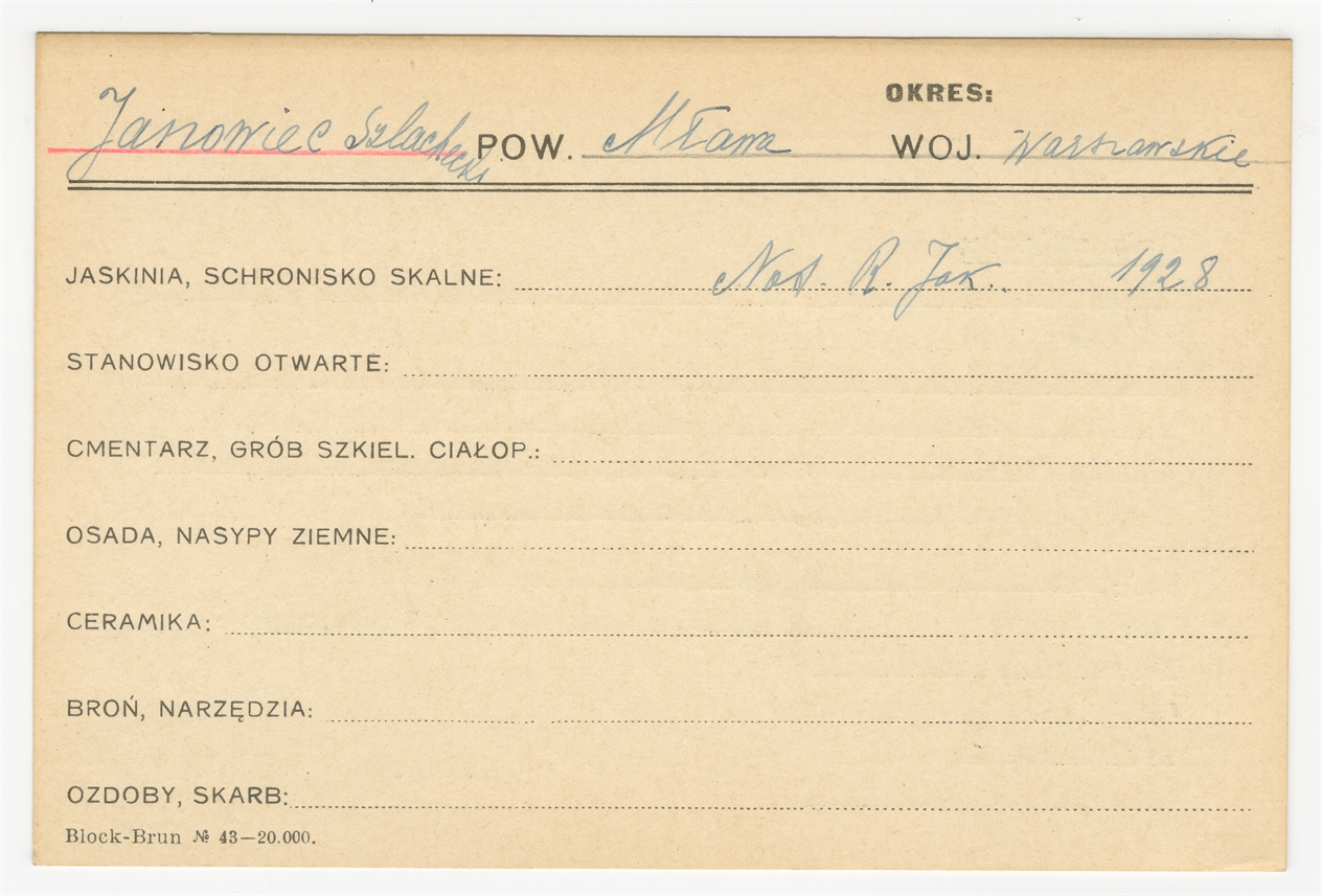 Karta stanowiska "Janowiec Szlachecki pow. Mława woj. warszawskie" (druk rękopis) - strona 1
