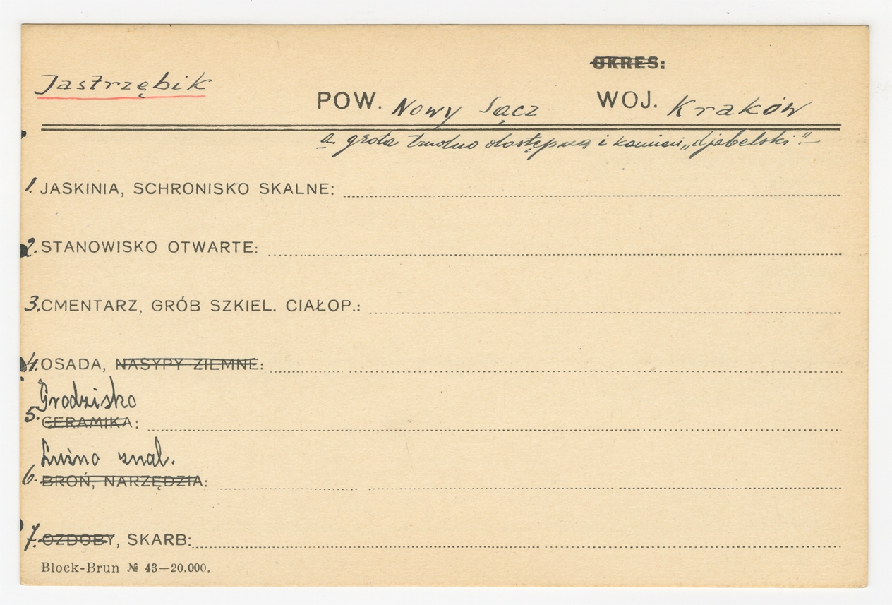 Karta stanowiska "Jastrzębik pow. Nowy Sącz woj. Kraków" (druk rękopis) - strona 1