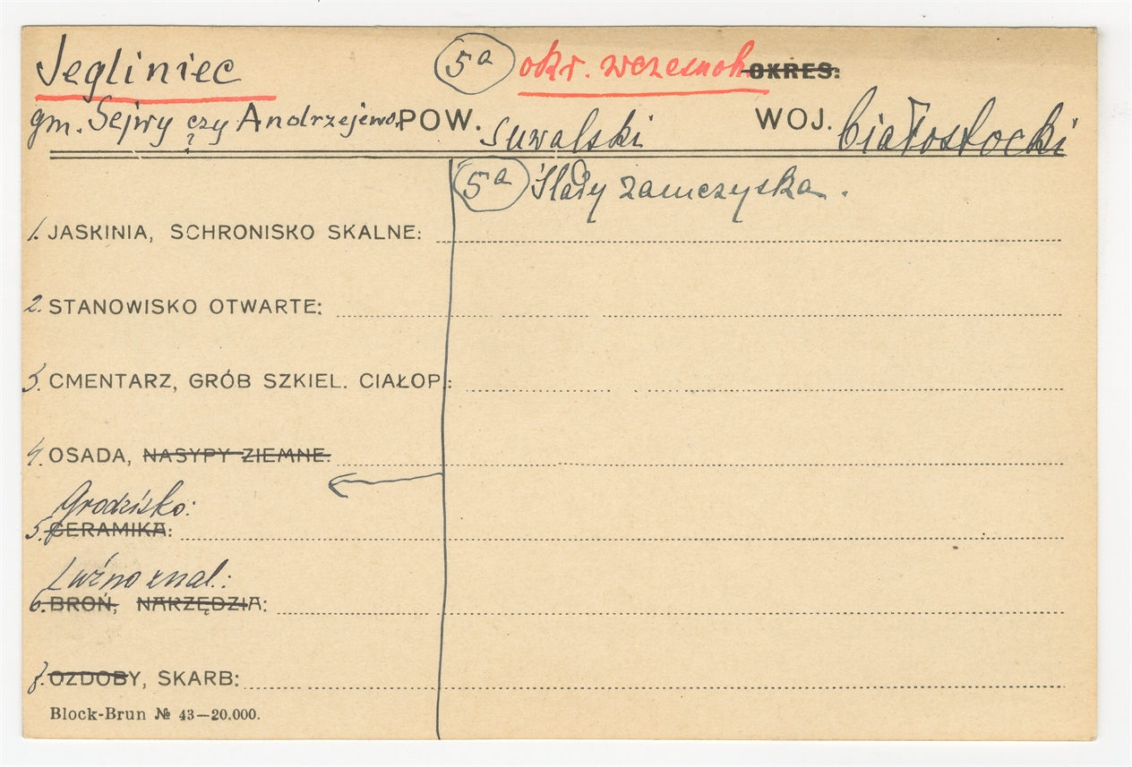 Karta stanowiska "Jegliniec gm. Sejwy czy Andrzejewo? pow. Suwalski woj. biaostockie" (druk rękopis) - strona 1