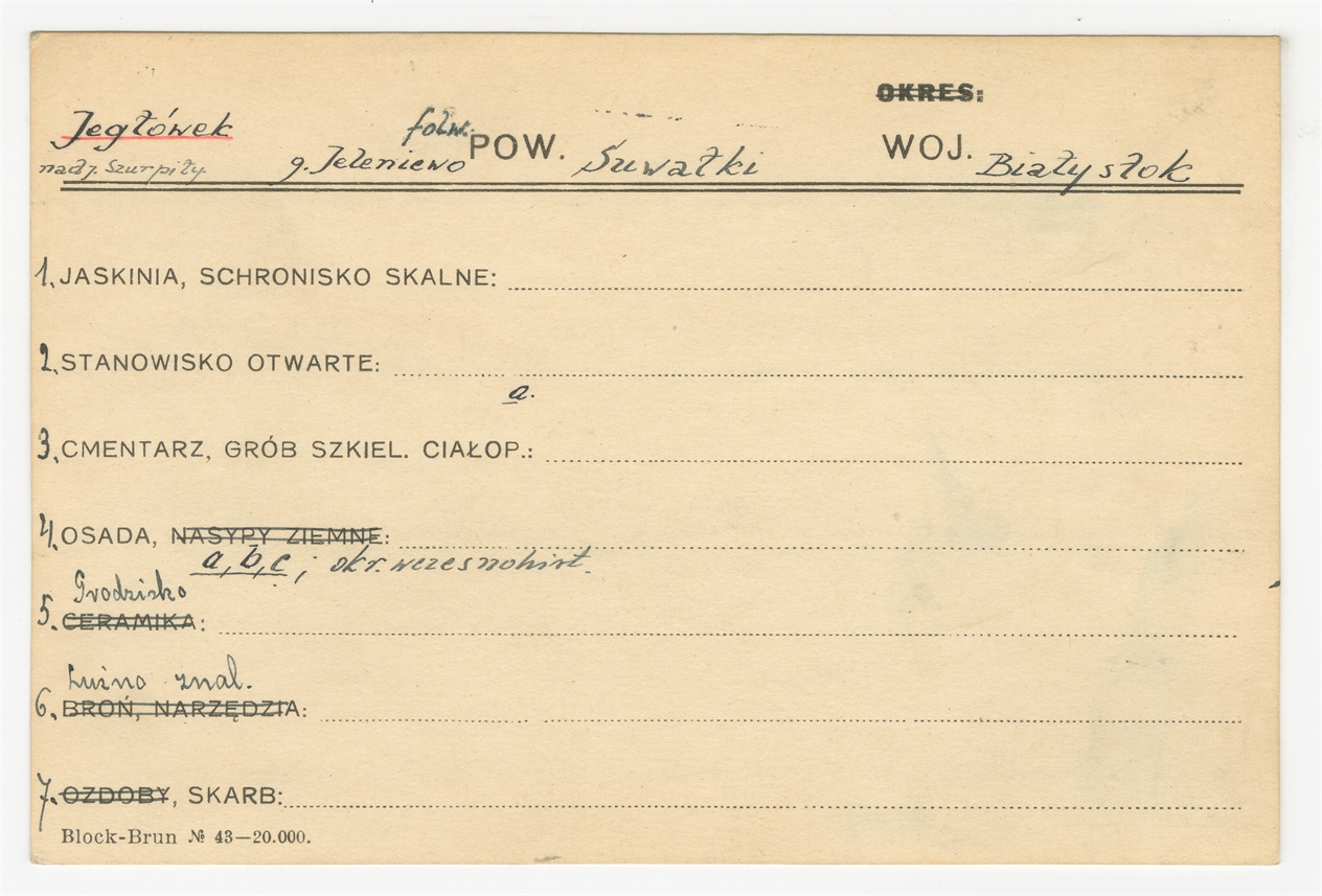 Karta stanowiska "Jegłówek nad j. Szurpiły g. Jeleniewo pow Suwałki woj. Białystok" (druk rękopis) - strona 1