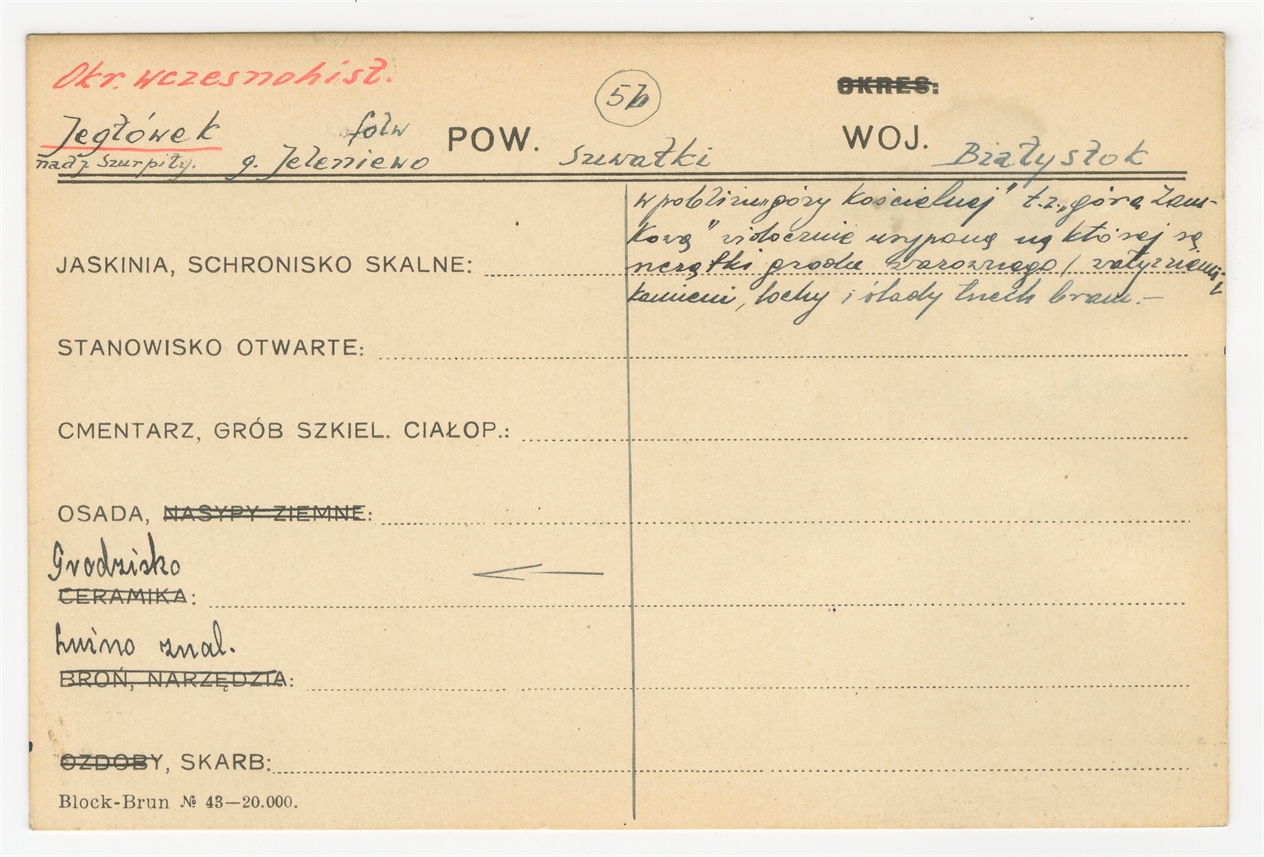Karta stanowiska "Jegłówek nad j. Szurpiły g. Jeleniewo pow Suwałki woj. Białystok" (druk rękopis) - strona 1