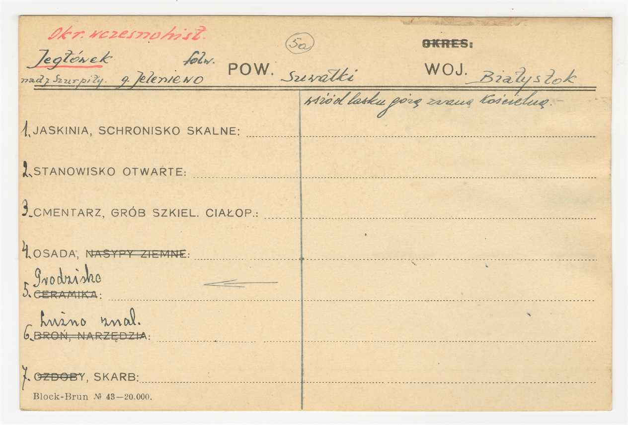 Karta stanowiska "Jegłówek nad j. Szurpiły g. Jeleniewo pow Suwałki woj. Białystok" (druk rękopis) - strona 1