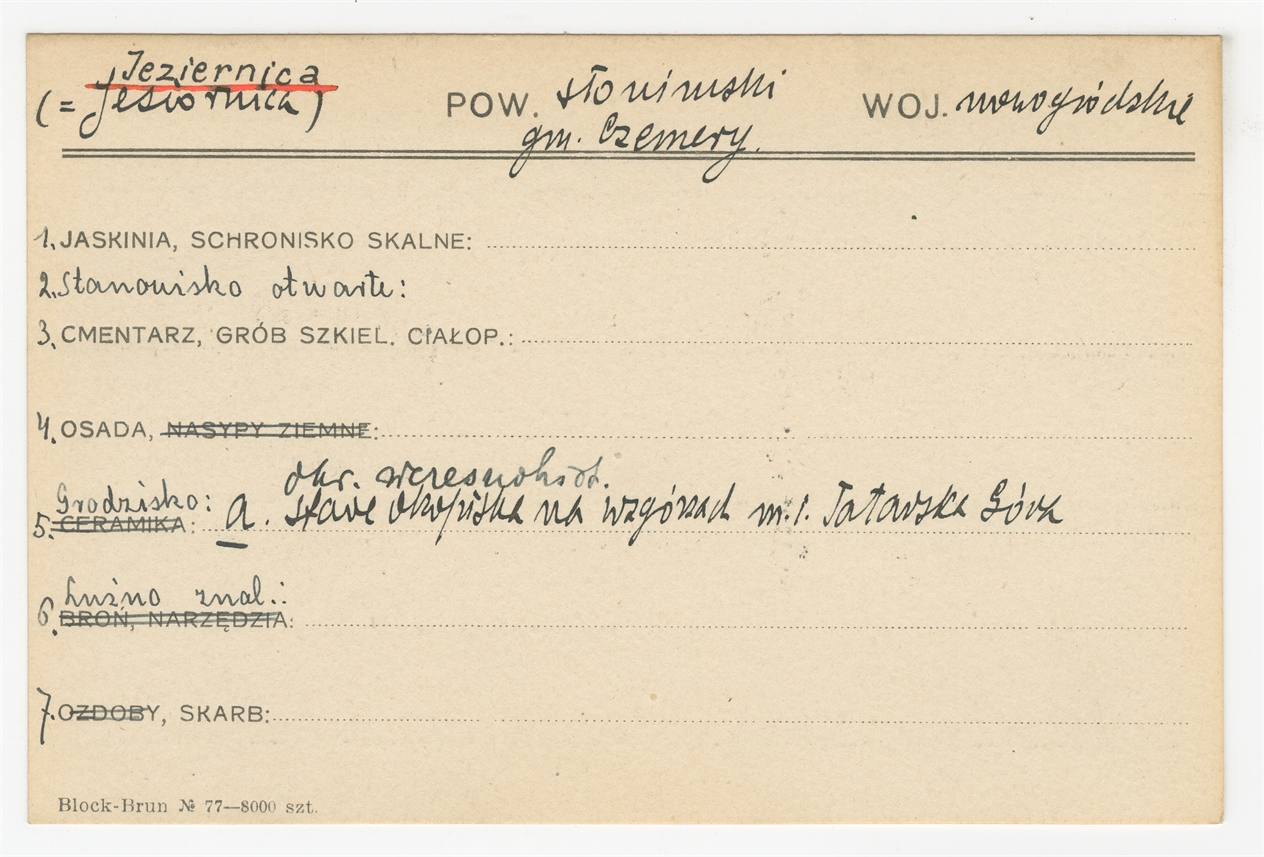 Karta stanowiska "Jeziernica (=Jesiornica) gm. Czemery pow. słonimski woj. nowogródzkie" (druk rękopis) - strona 1