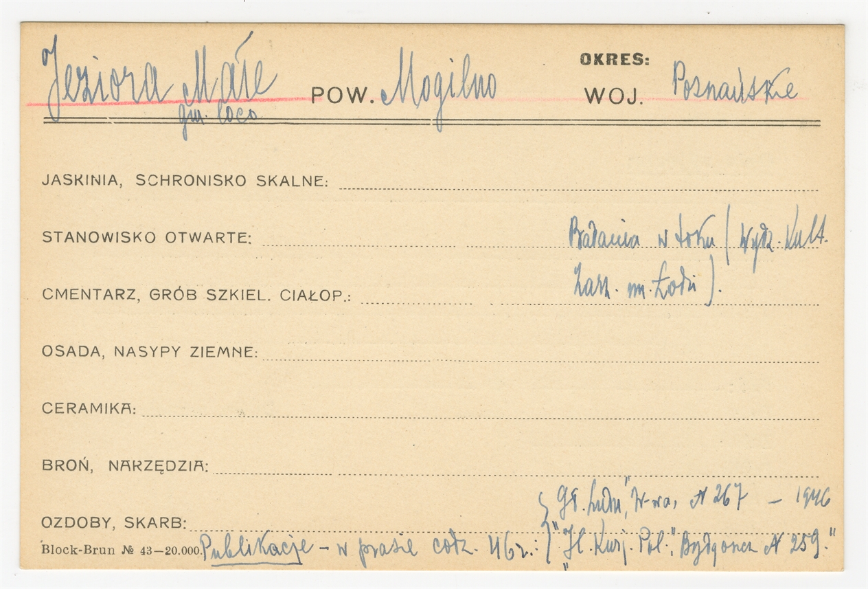 Karta stanowiska "Jeziora Małe gm. loco pow. Mogilno woj. Poznańskie" (druk rękopis) - strona 1