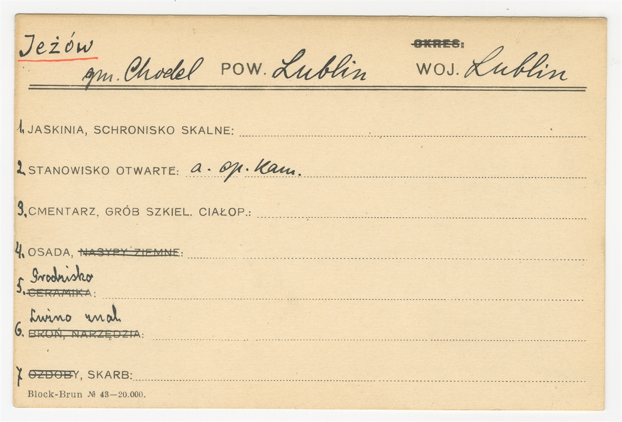 Karta stanowiska "Jeżów gm. Chodel pow. Lublin woj. Lublin" (druk rękopis) - strona 1