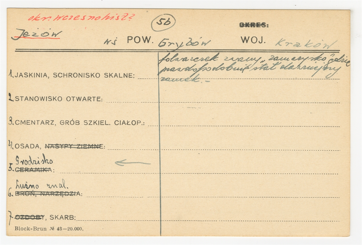Karta stanowiska "Jeżów gm. Grybów woj. Kraków" (druk rękopis) - strona 1