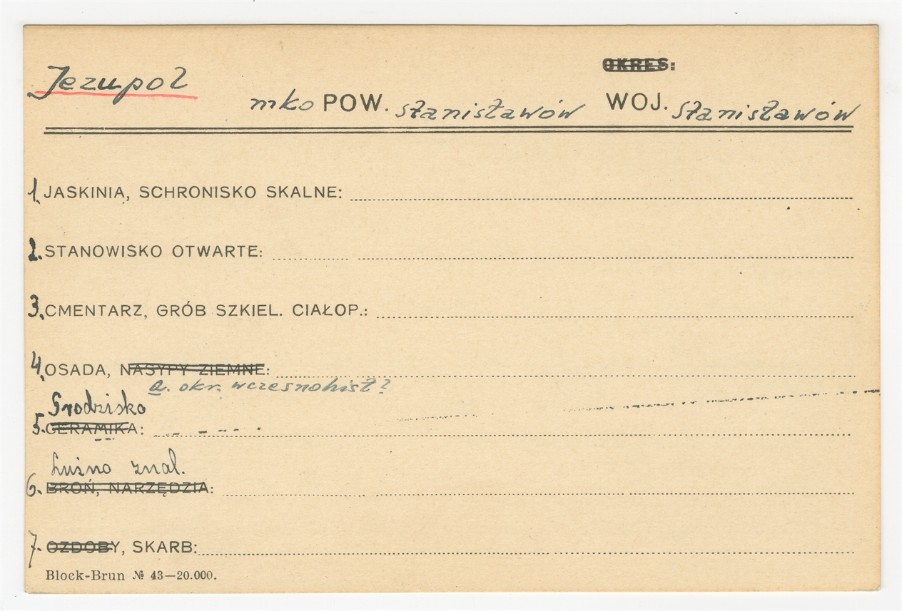 Karta stanowiska "Jezupol pow. Stanisławów woj. Stanisławów" (druk rękopis) - strona 1