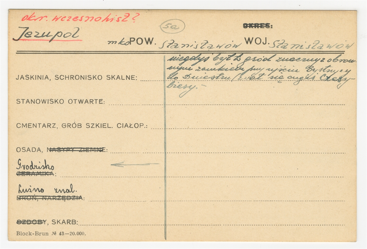 Karta stanowiska "Jezupol pow. Stanisławów woj. Stanisławów" (druk rękopis) - strona 1