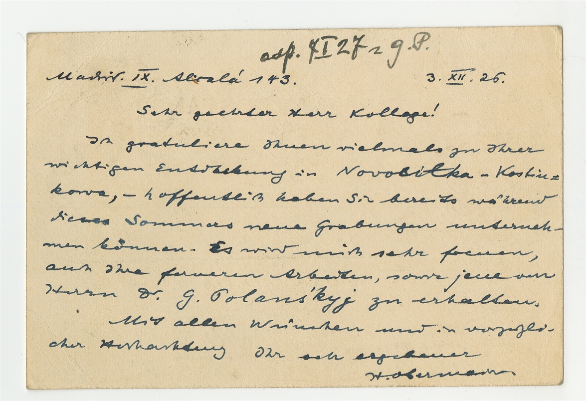 Kartka pocztowa w języku niemieckim od Hugo Obermaiera do Stefana Krukowskiego z dnia 3 XII [19]26 roku - rewers
