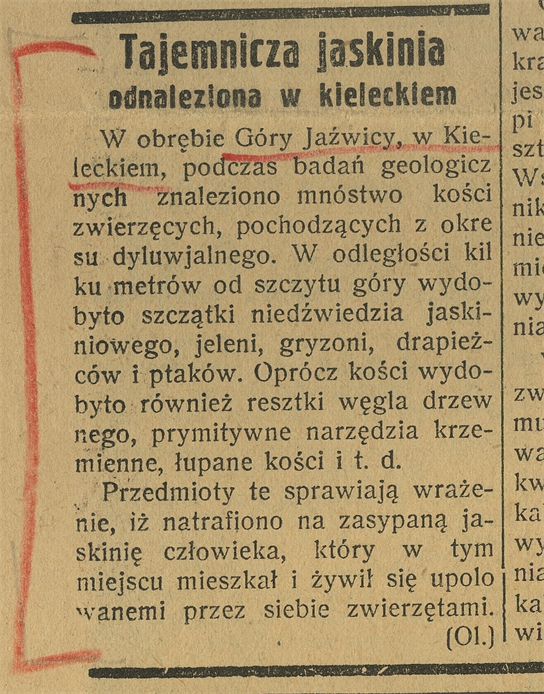 Kartka z „Wieczoru Warszawskiego” nr 209 26 lipca 1935 r. z zaznaczonym artykułem: „Tajemnicza jaskinia odnaleziona w kieleckiem” str. 1: „ Tajemnicza jaskinia odnaleziona w kieleckiem”