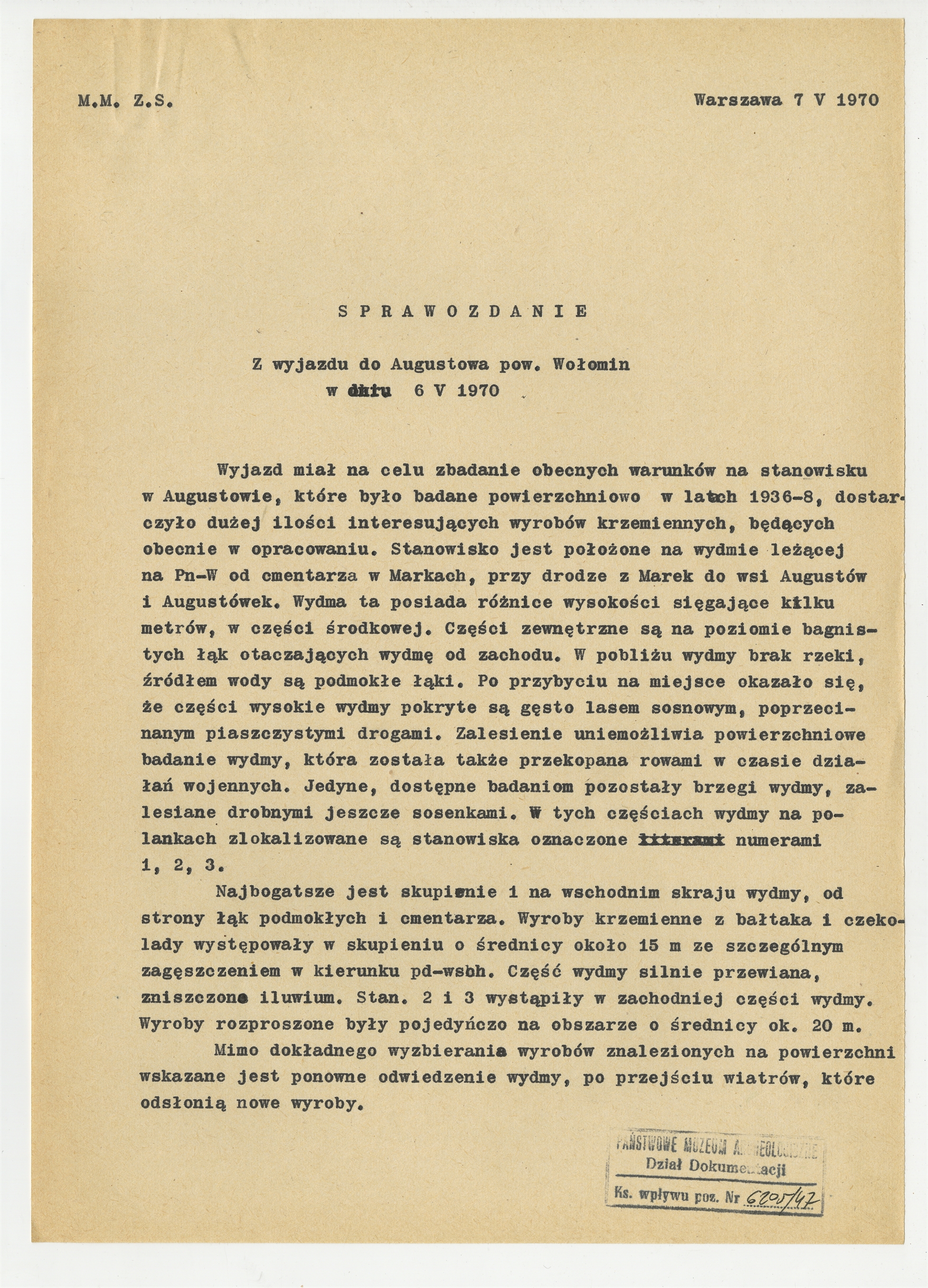 Maszynopis dokumentu pt. "Sprawozdanie. Z wyjazdu do Augustowa pow. Wołomin w dniu 6 V 1970" opatrzony inicjałami M.M. (Marek Młynarski?) oraz Z.S. (Zofia Sulgostowska?) Warszawa 7 V 1970 r. - strona 1