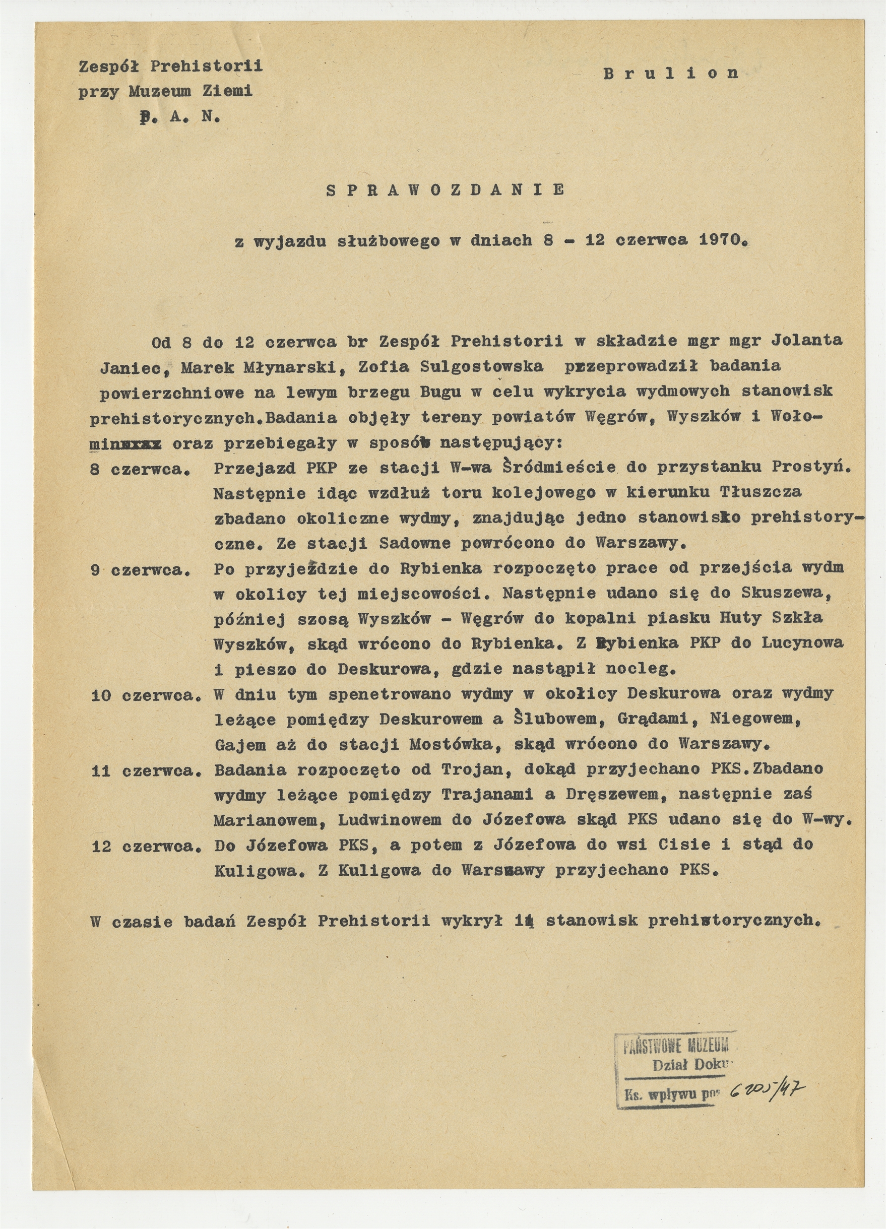 Maszynopis dokumentu pt. "Sprawozdanie z wyjazdu służbowego w dniach 8 - 12 czerwca 1970" sporządzony przez Zespół Prehistorii przy Muzeum Ziemi PAN - strona 1