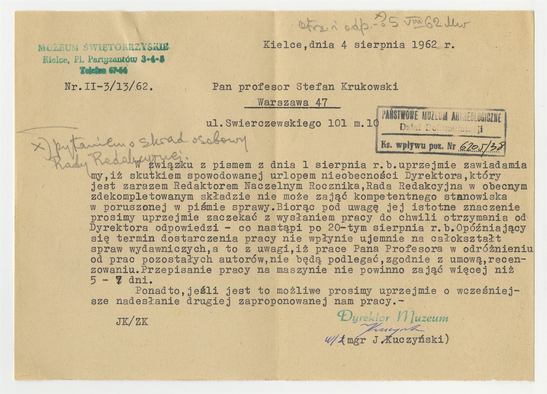 Maszynopis - list Janusza Kuczyńskiego w/z dyrektora Muzeum Świętokrzyskiego do Stefana Krukowskiego z dnia 4 sierpnia 1962 roku
