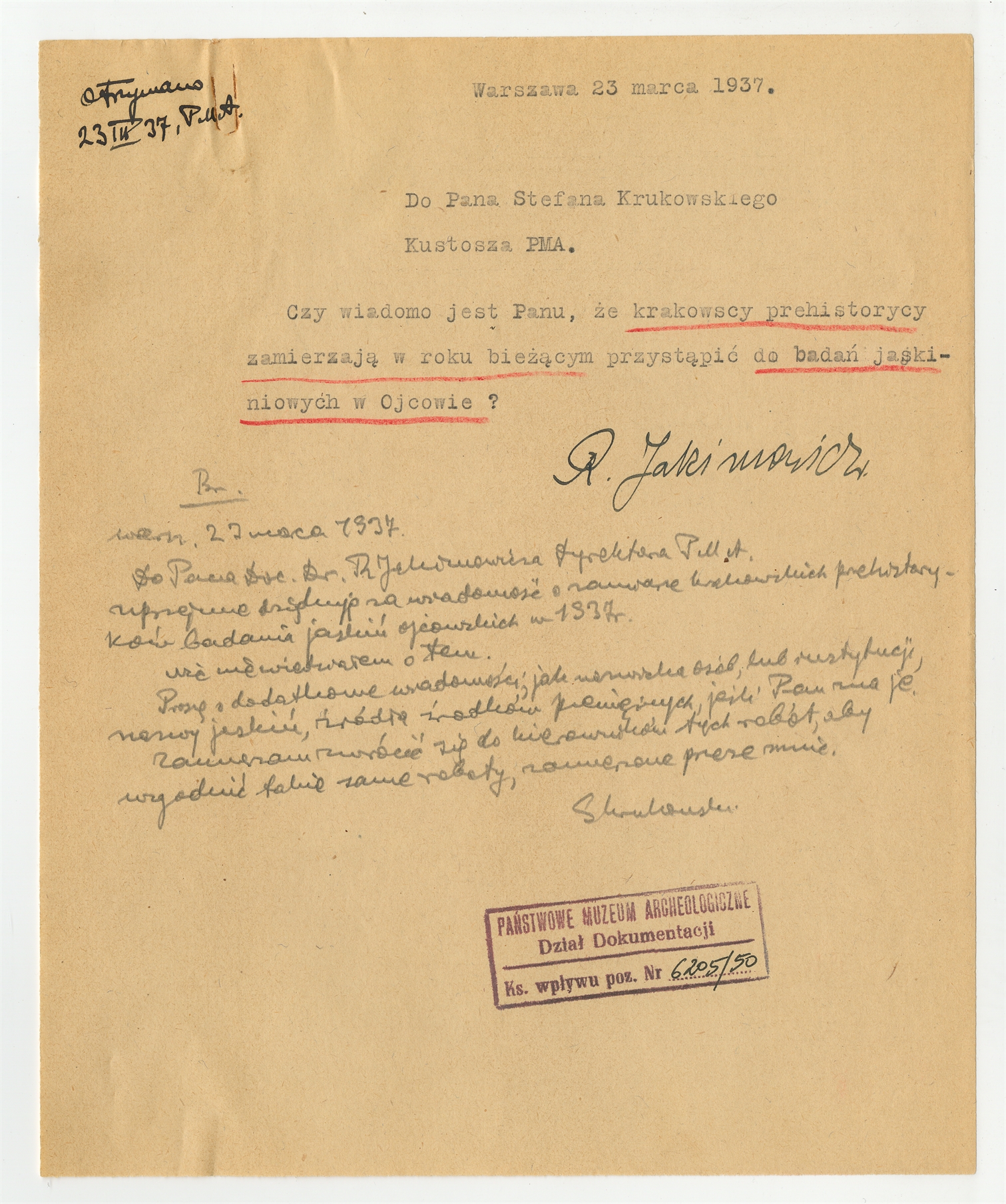 Maszynopis - list Romana Jakimowicza do Stefana Krukowskiego z dn. 23 III 1937 r.; Rękopis - brudnopis listu Stefana Krukowskiego do Romana Jakimowicza z dn. 23 III 1937 r.