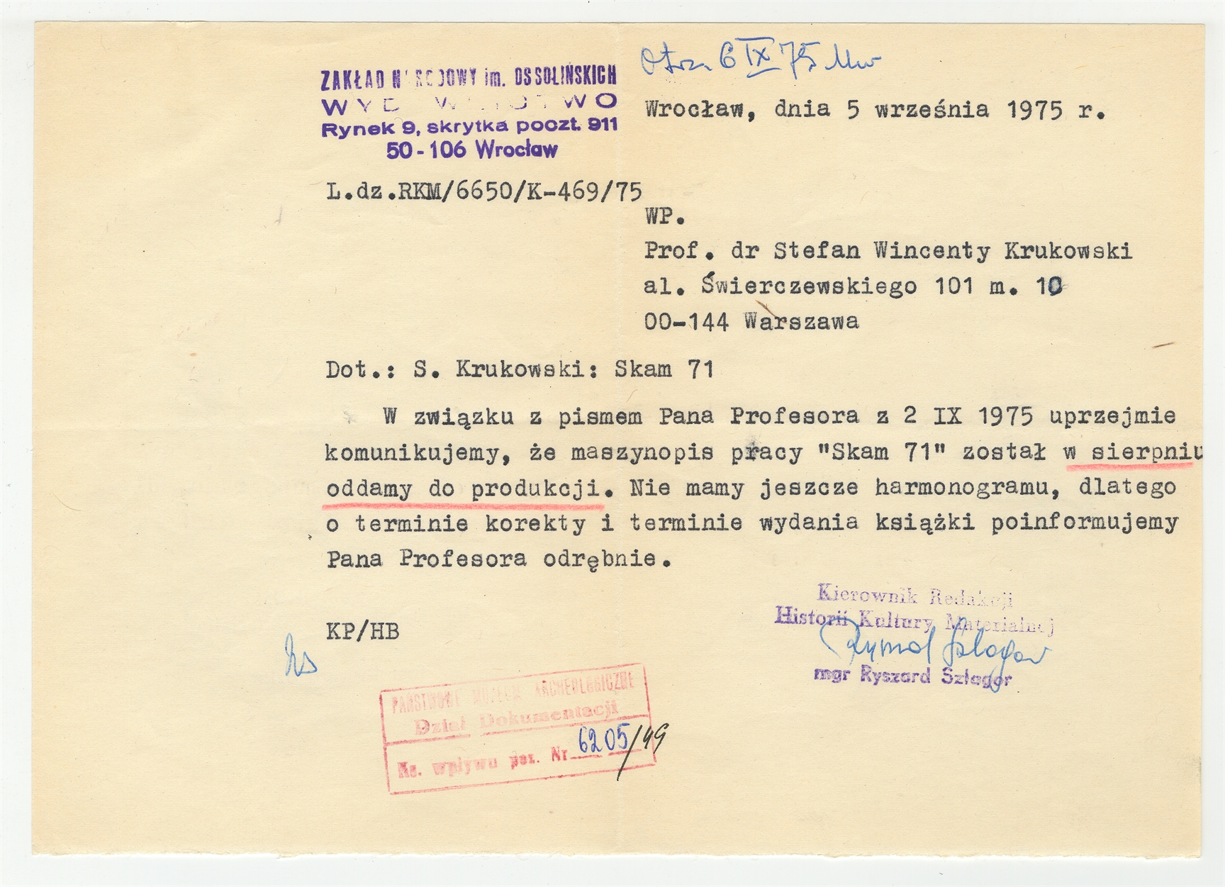 Maszynopis - list Ryszarda Szlagora z Zakładu Narodowego im. Ossolińskich do Stefana Krukowskiego z dn. 5 IX 1975 r.;Rękopis - notataka Stefana Krukowskiego z dn. 6 IX [19]75 r.