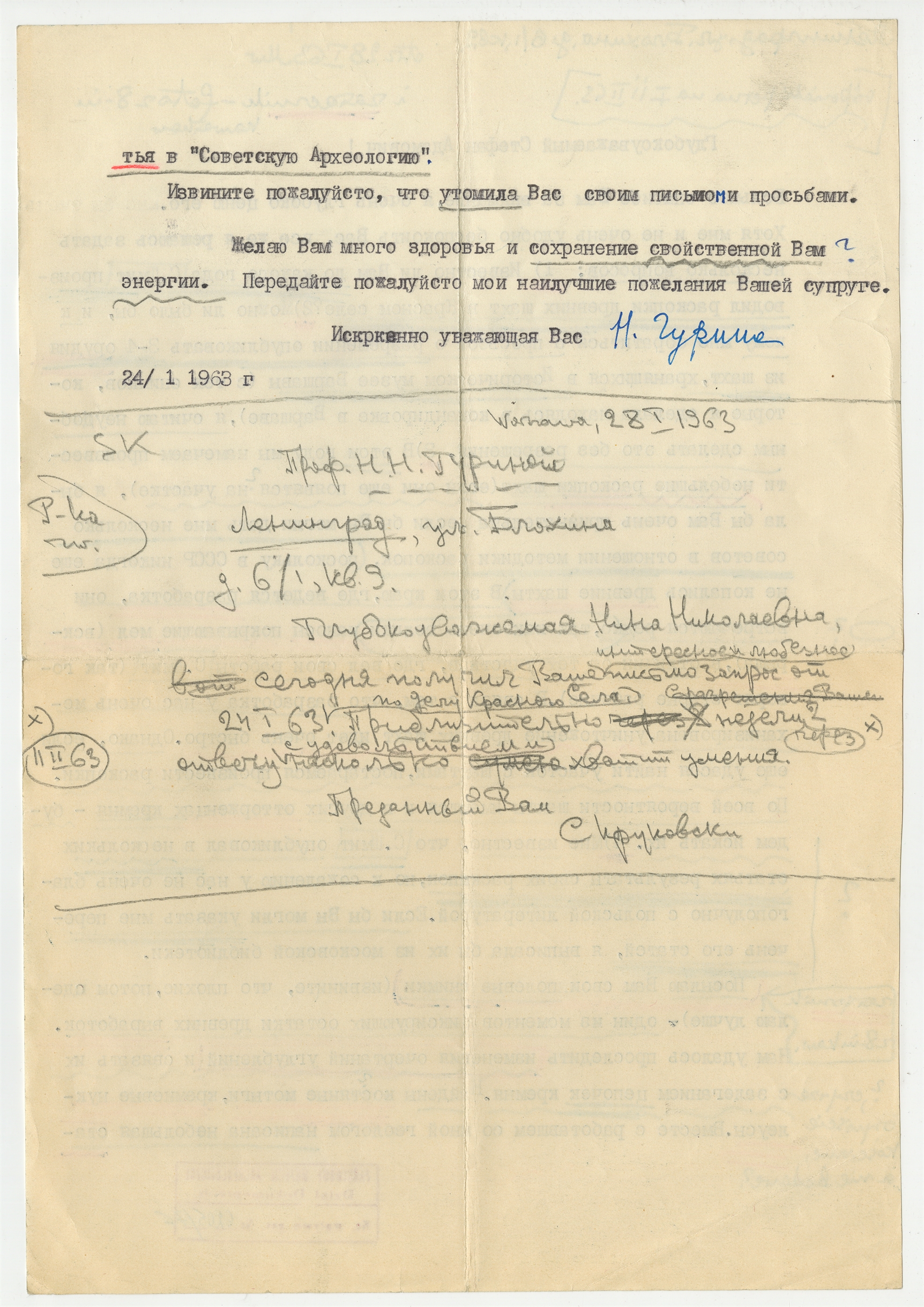 Maszynopis - list w j. rosyjskim Niny Guriny do Stefana Krukowskiego z dnia 24 I 1963 roku. Rękopis - brudnopis odpowiedzi S. Krukowskiego na list.