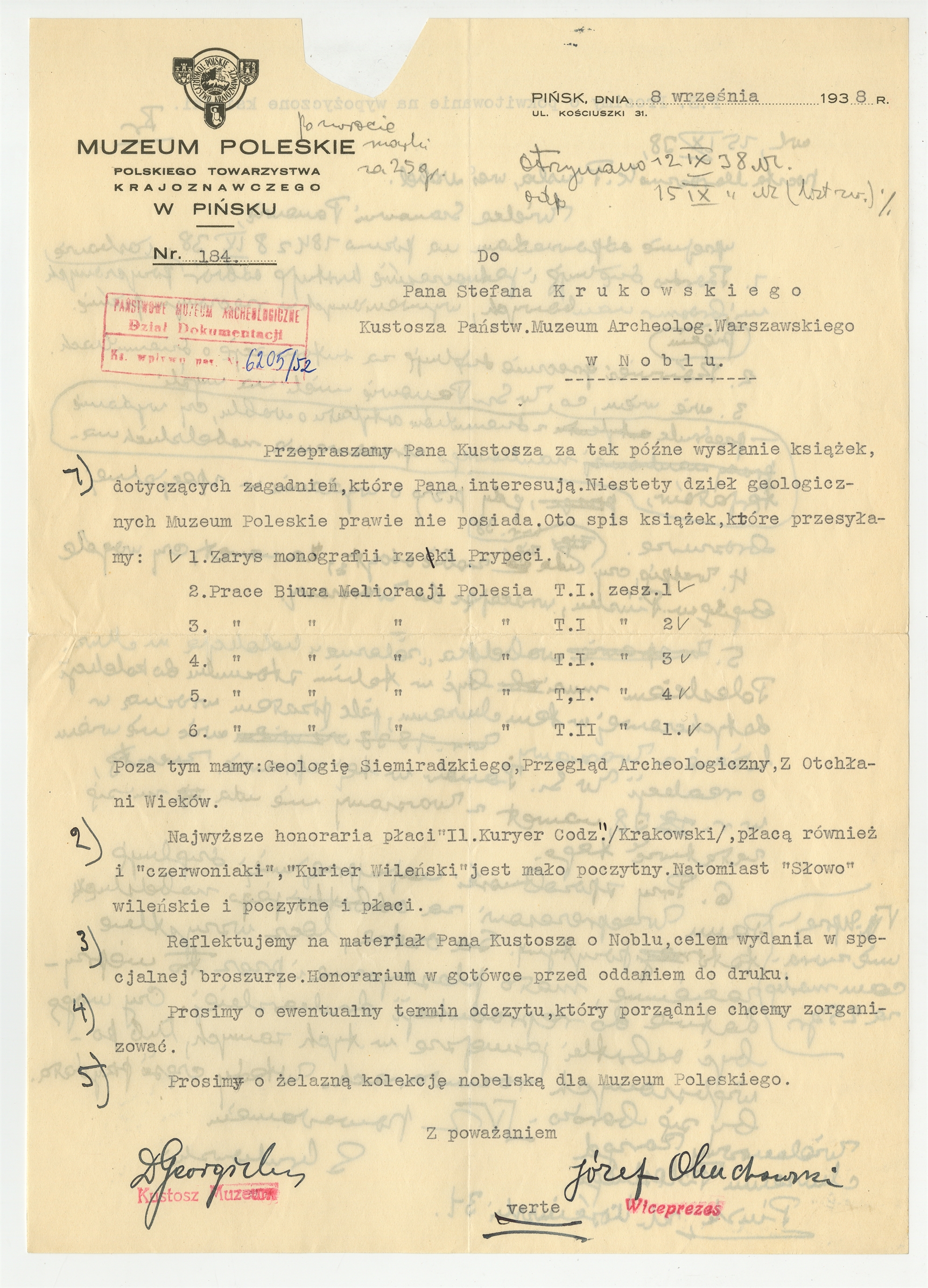 Maszynopis - list z Muzeum Poleskiego w Pińsku do Stefana Krukowskiego z dnia 8 września 1938 roku