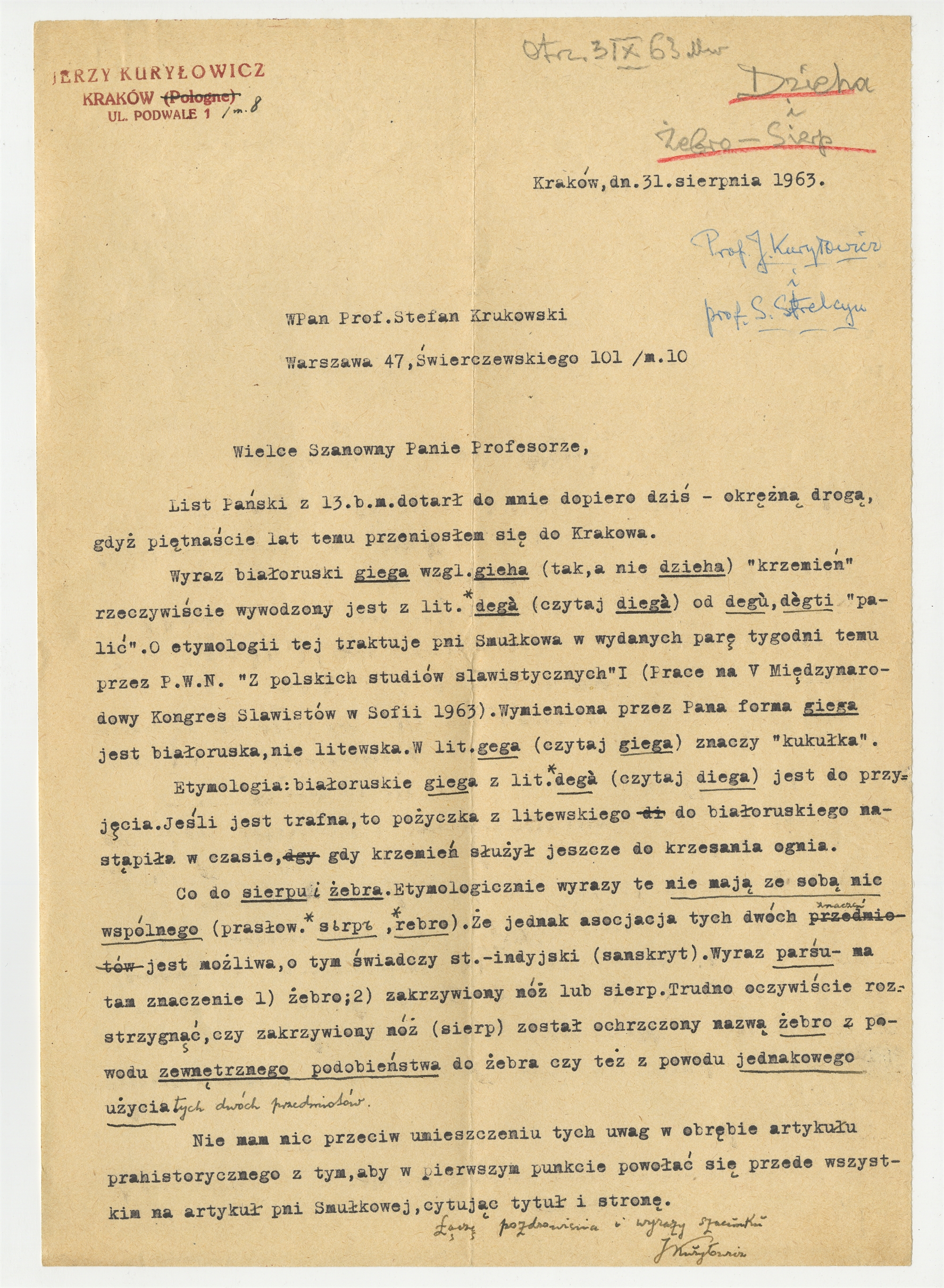 Maszynopis listu prof. Jerzego Kuryłowicza do prof. S. Krukowskiego objaśniającego pochodzenie słowa "gieha" oraz uzasadniającego brak etymologicznego powiązania między wyrazami "siep i "żebro" Kraków 31 sierpnia 1963 r. - strona 1
