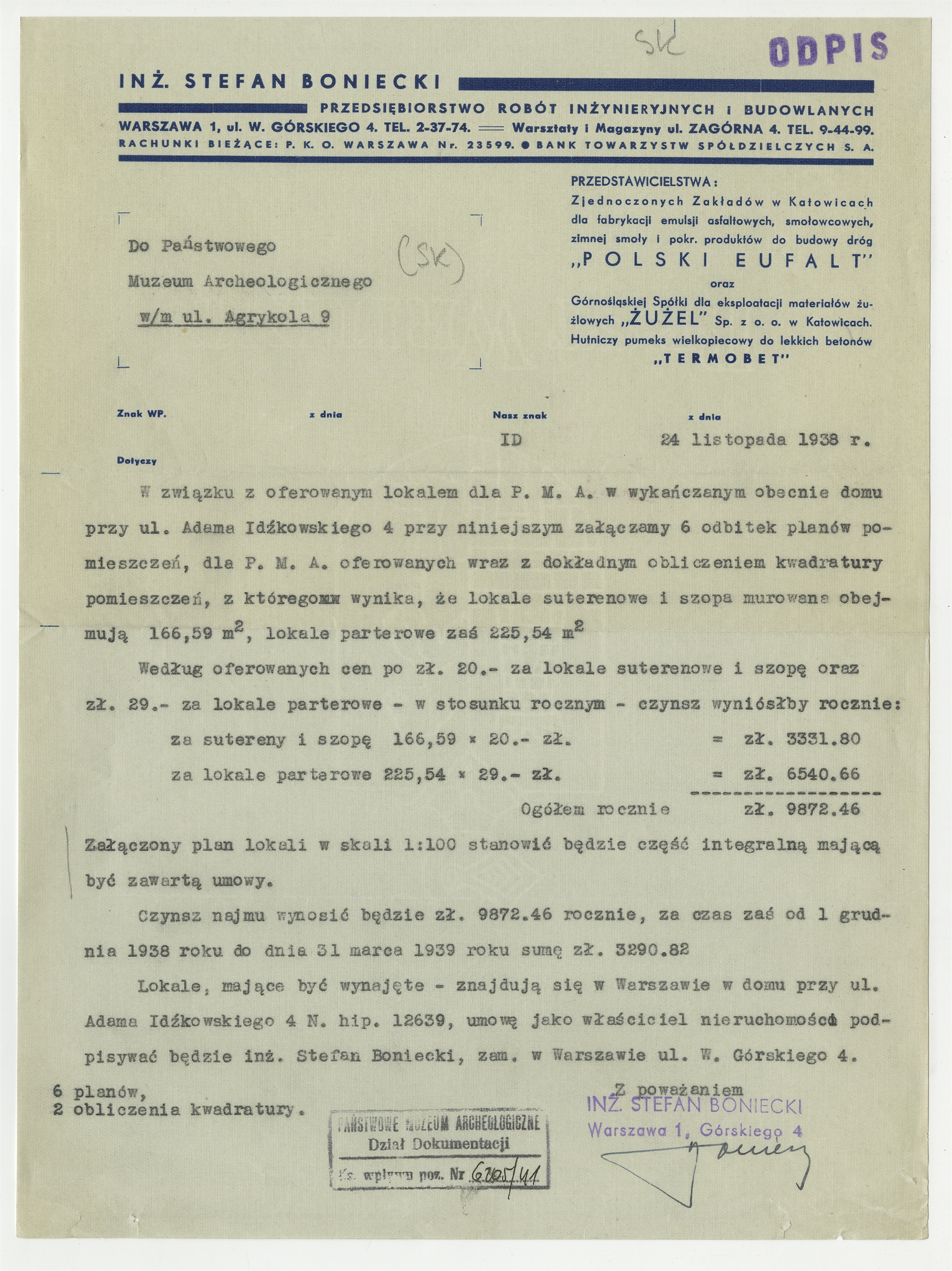 Maszynopis-odpis pisma od inż. Stefana Bonieckiego z dn 24 XI 1938 r. skierowanego do PMA w sprawie lokalu dla PMA