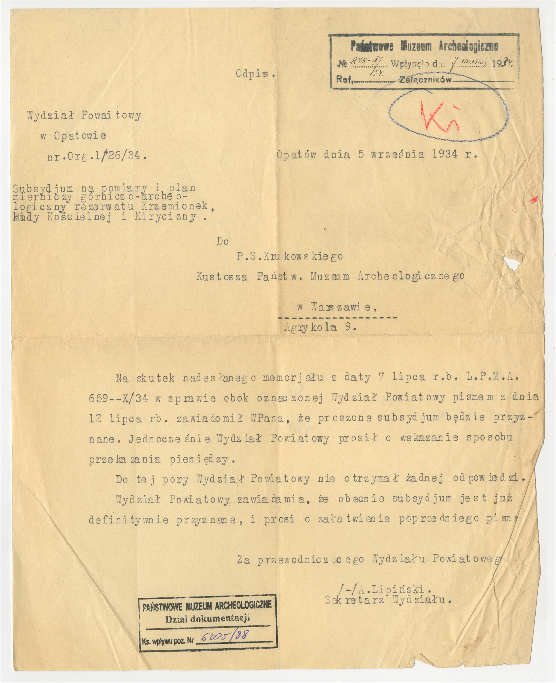 Maszynopis - odpis pisma Wydziału Powiatowego w Opatowie do Stefana Krukowskiego Kustosza PMA z informacją o przyznaniu subsydium na pomiary i plan mierniczy Krzemionek Rudy Kościelnej i Korycizny oraz z prośbą o wskazanie sposobu przekazania pieniędzy Opatów 5 września 1934 r. (nr pisma 1/26/34) - strona 1