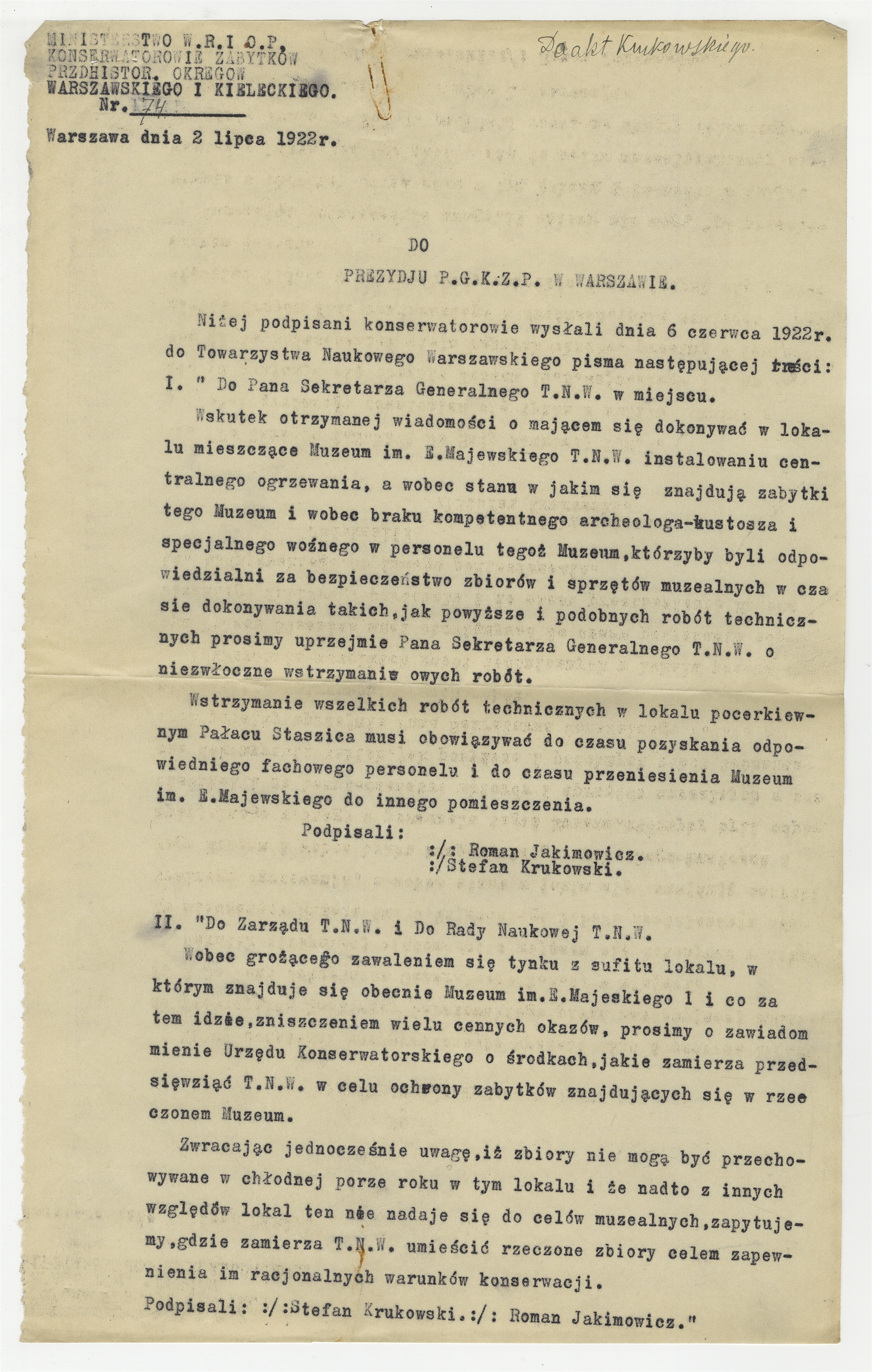 Maszynopis pisma do Prezudium Państwowego Grona Konserwatorów Zabytków Przedhistorycznych w sprawie zagrożonego bezpieczeństwa zabytków Muzeum im. E. Majewskiego 2 lipca 1922 r. - strona 1