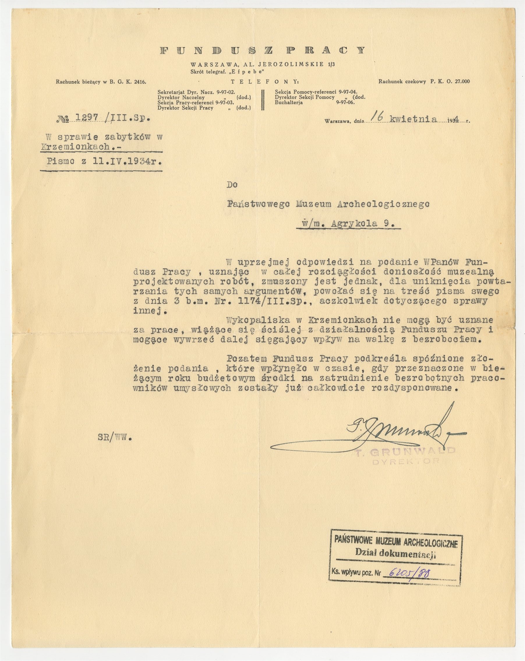 Maszynopis pisma Funduszu Pracy do Państwowego Muzeum Archeologicznego w Warszawie w sprawie zabytków w Krzemionkach Warszawa 16 kwietnia 1934 r. (nr pisma 1297/III.Sp.) - strona 1
