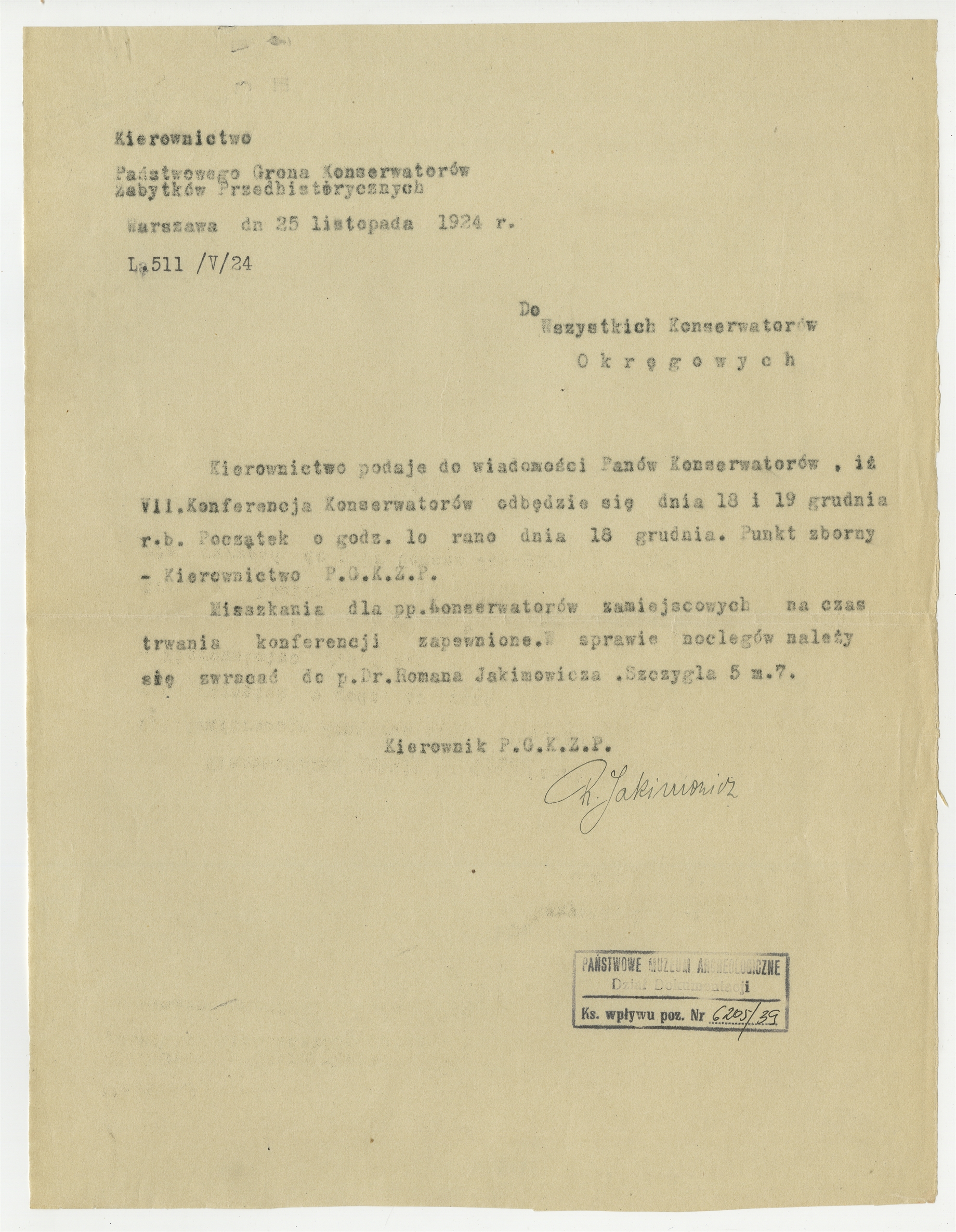Maszynopis pisma Kierownika Państwowego Grona Konserwatorów Zabytków Przedhistorycznych Romana Jakimowicza do Konserwatorów Okręgowych z informacją o terminie VII Konferencji Konserwatorów Warszawa 25 listopada 1924 r. - strona 1