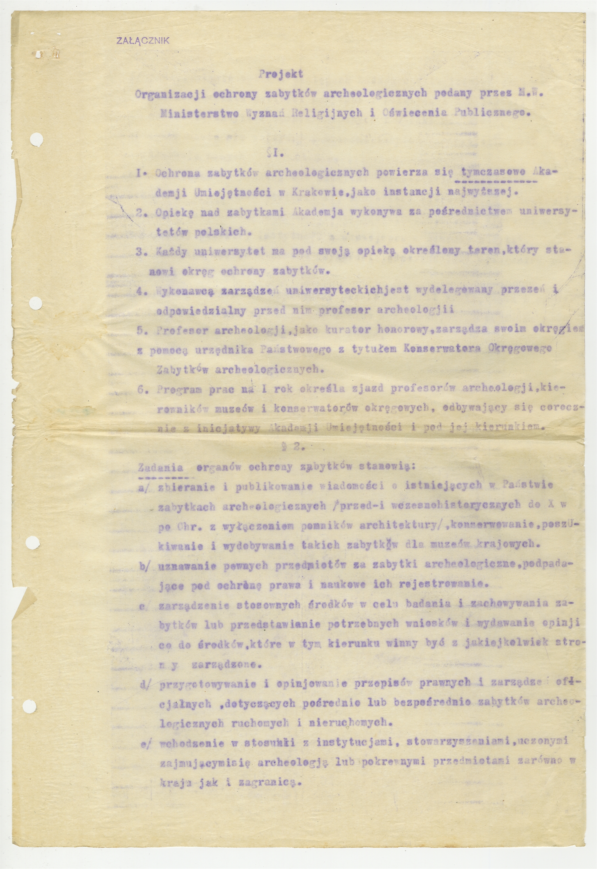 Maszynopis pisma Prezydjum Państwowego Grona Konserwatorów Zabytków Przedhistorycznych do Stefana Krukowskiego Konserwatora Okręgowego w Warszawie z prośbą o zaopiniowanie nowego projektu organizacji ochrony zabytków archeologicznych przedstawionego przez Ministerstwo Wyznań Religijnych i Oświecenia Publicznego (w załączniku pisma) Warszawa 7 czerwca 1920 r. - strona 2: "Projekt" (§ 1 2)