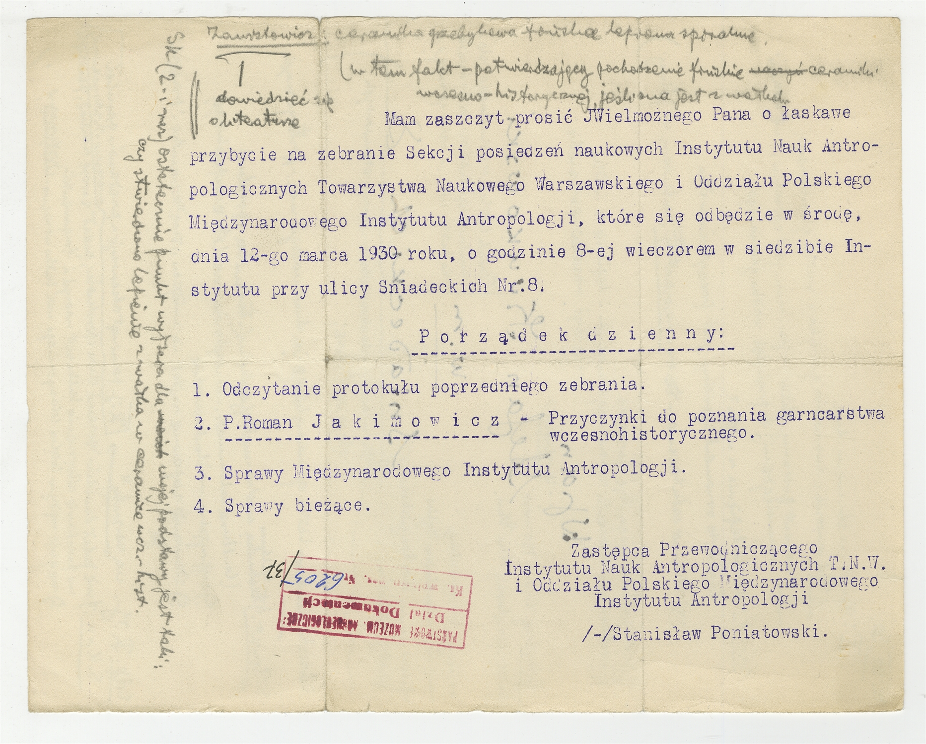 Maszynopis pisma Stanisława Poniatowskiego Zastępcy Przewodniczącego Instytutu Nauk Antropologicznych T.N.W. i Oddziału Polskiego Międzynarodowego Instytutu Antropologii do Stefana Krukowskiego z zaproszeniem na zebranie w dniu 12 marca 1930 r. - strona 1: zaproszenie