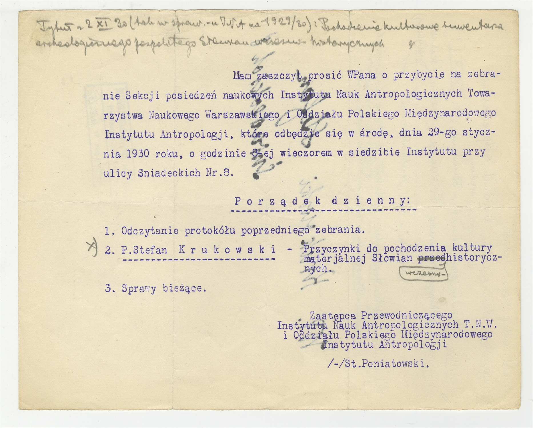 Maszynopis pisma Stanisława Poniatowskiego Zastępcy Przewodniczącego Instytutu Nauk Antropologicznych T.N.W. i Oddziału Polskiego Międzynarodowego Instytutu Antropologii do Stefana Krukowskiego z zaproszeniem na zebranie w dniu 29 stycznia 1930 r. - strona 1: zaproszenie