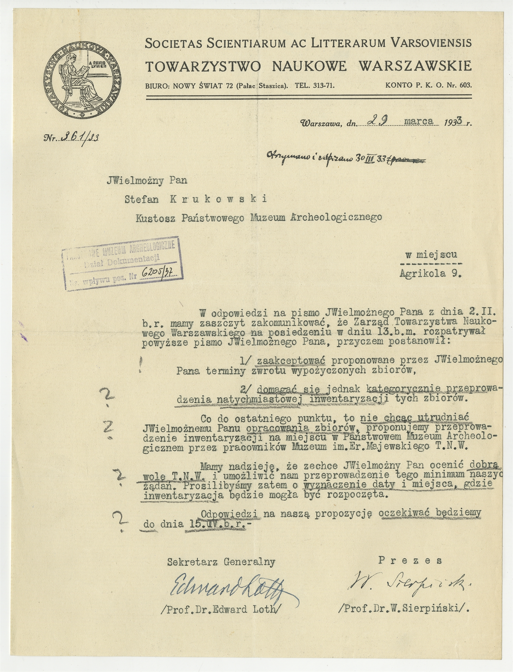 Maszynopis pisma Towarzystwa Naukowego Warszawskiego do Stefana Krukowskiego w sprawie zaakceptowania zaproponowanego terminu zwrotu opracowywanych przez S. Krukowskiego materiałów archeologicznych oraz wyznaczenia terminu przeprowadzenia inwentaryzacji tych zbiorów przez pracowników TNW Warszawa 29 marca 1933 - strona 1
