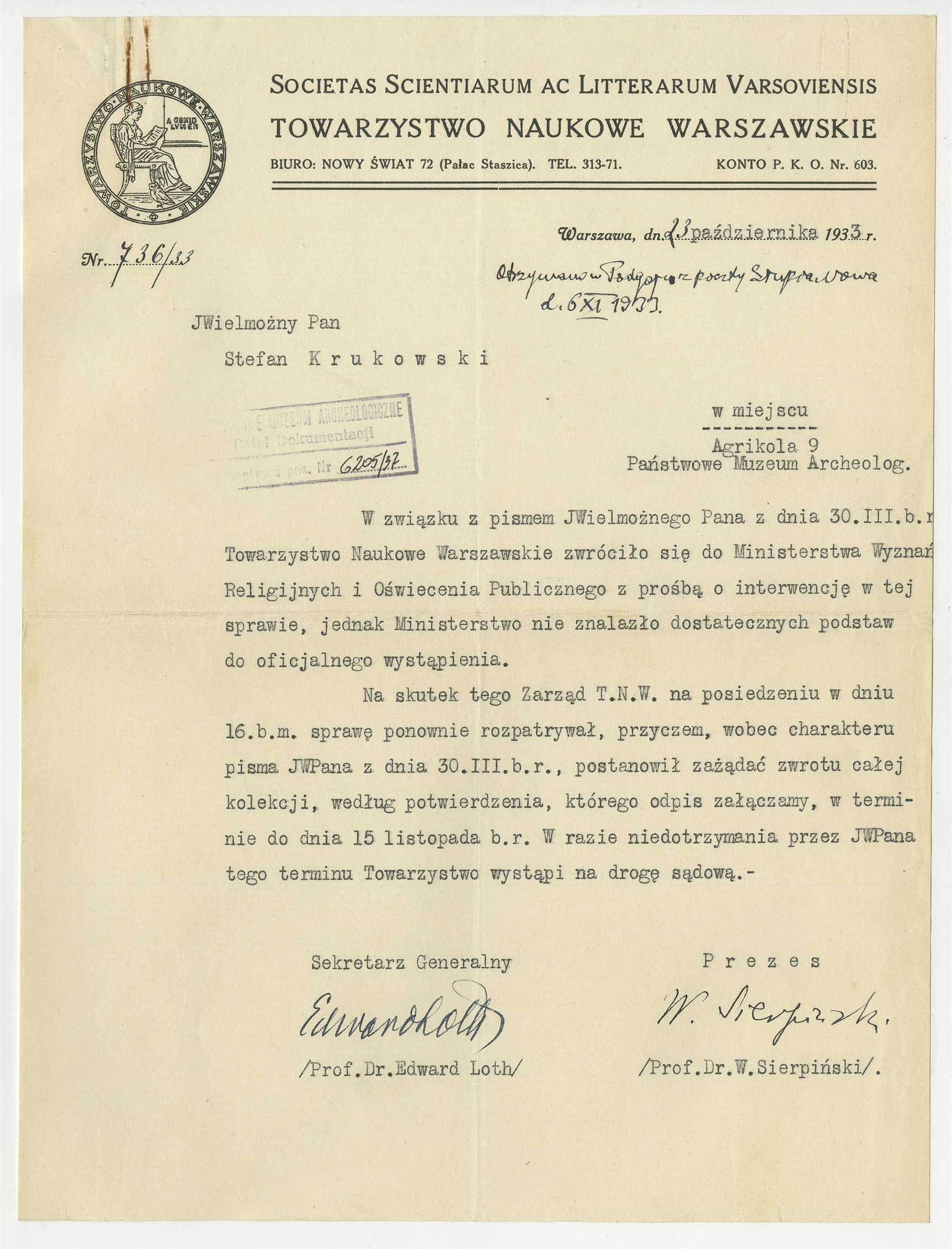 Maszynopis pisma Towarzystwa Naukowego Warszawskiego do Stefana Krukowskiego w sprawie zwrotu całej kolekcji wypożyczonej przez S. Krukowskieog w celu opracowania Warszawa 23 października 1933 - strona 1