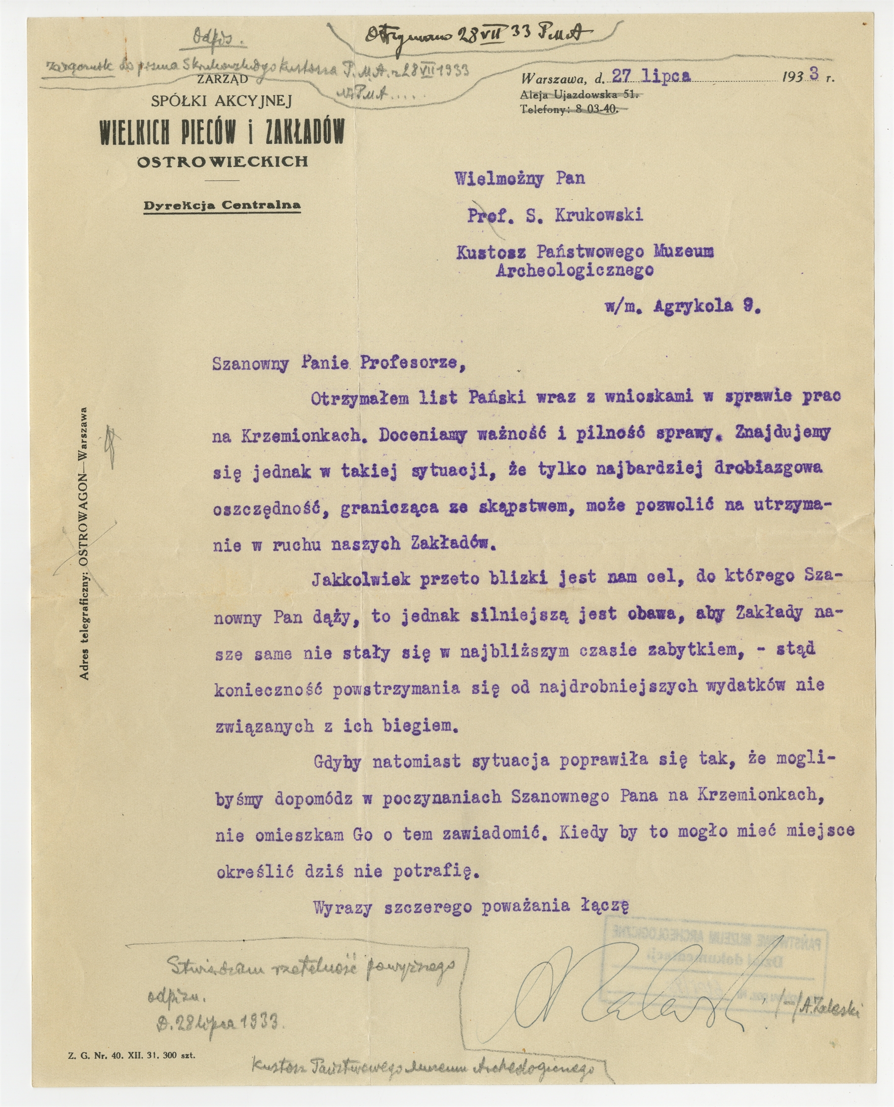 Maszynopis - pismo Zarządu Spółki Akcyjnej Wielkich Pieców i Zakładów Ostrowieckich do prof.. Stefana Krukowskiego Warszawa 27 VII 1933 r. - z ręcznymi notatkami prof. Krukowskiego "Odpis otrzymano 28 VII 33 PMA"