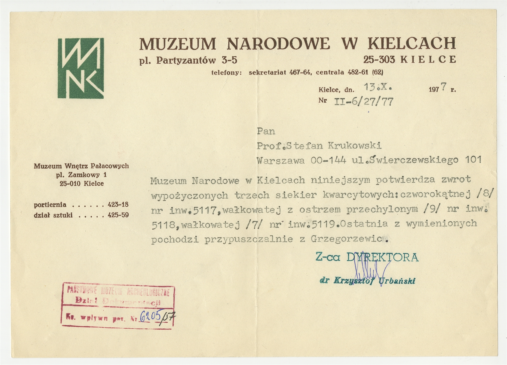 Maszynopis - potwierdzenie z dnia 13 X 1977 roku zwrotu przez Stefana Krukowskiego siekier kwarcytowych wypożyczonych z Muzeum Narodowego w Kielcach