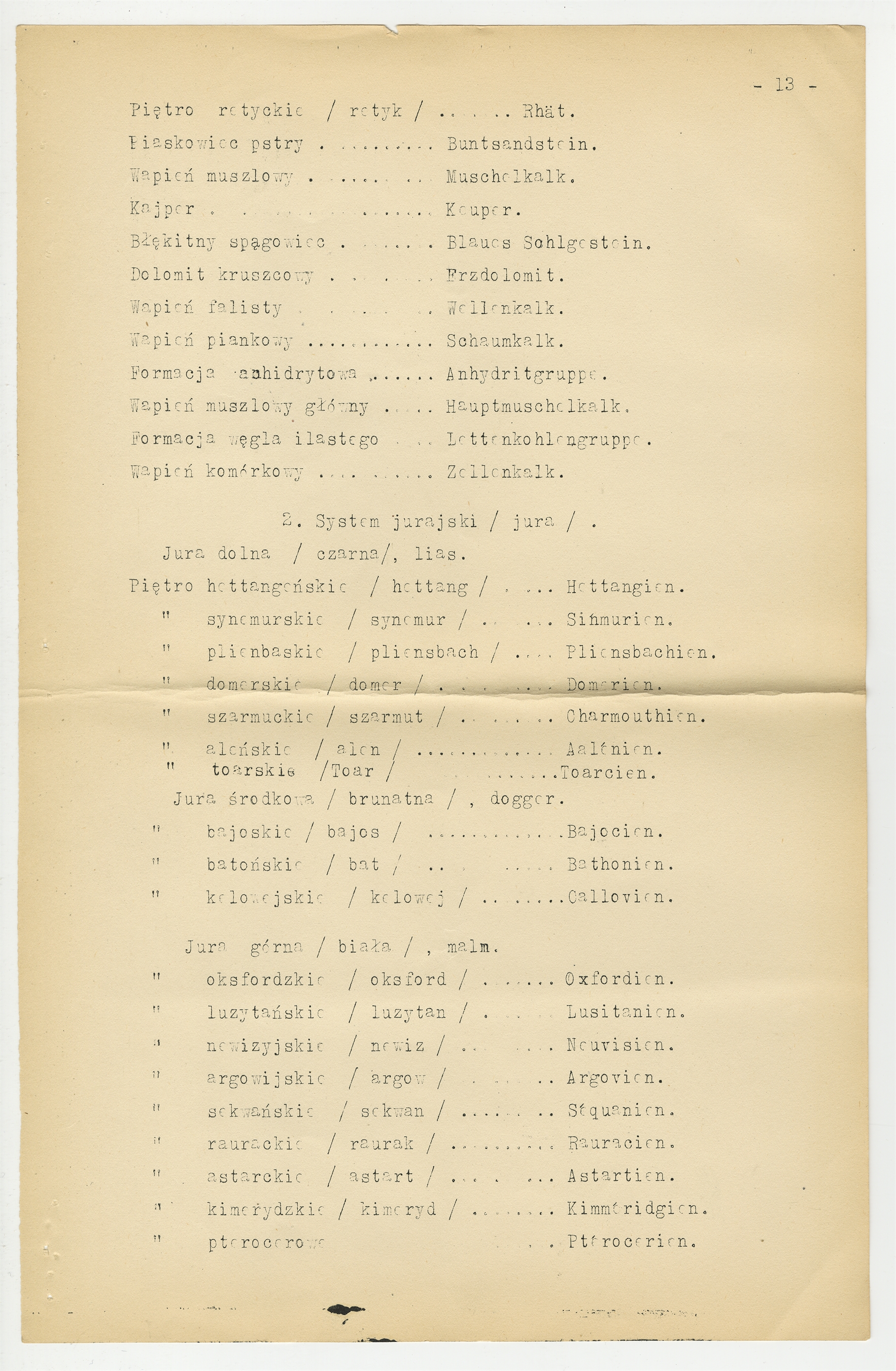Maszynopis projektu zatytułowanego "Słownictwo Geologiczne i Paleontologiczne" przysłany do prof. Stefana Krukowskiego z Komisji do Spraw Słownictwa Geologicznego i Paleontologicznego; Rozdział: Stratygrafja (cd) - Spis terminów zasadniczych i przykładowe spolszczenie niektórych terminów lokalnych dot ery mezozoicznej (cd)