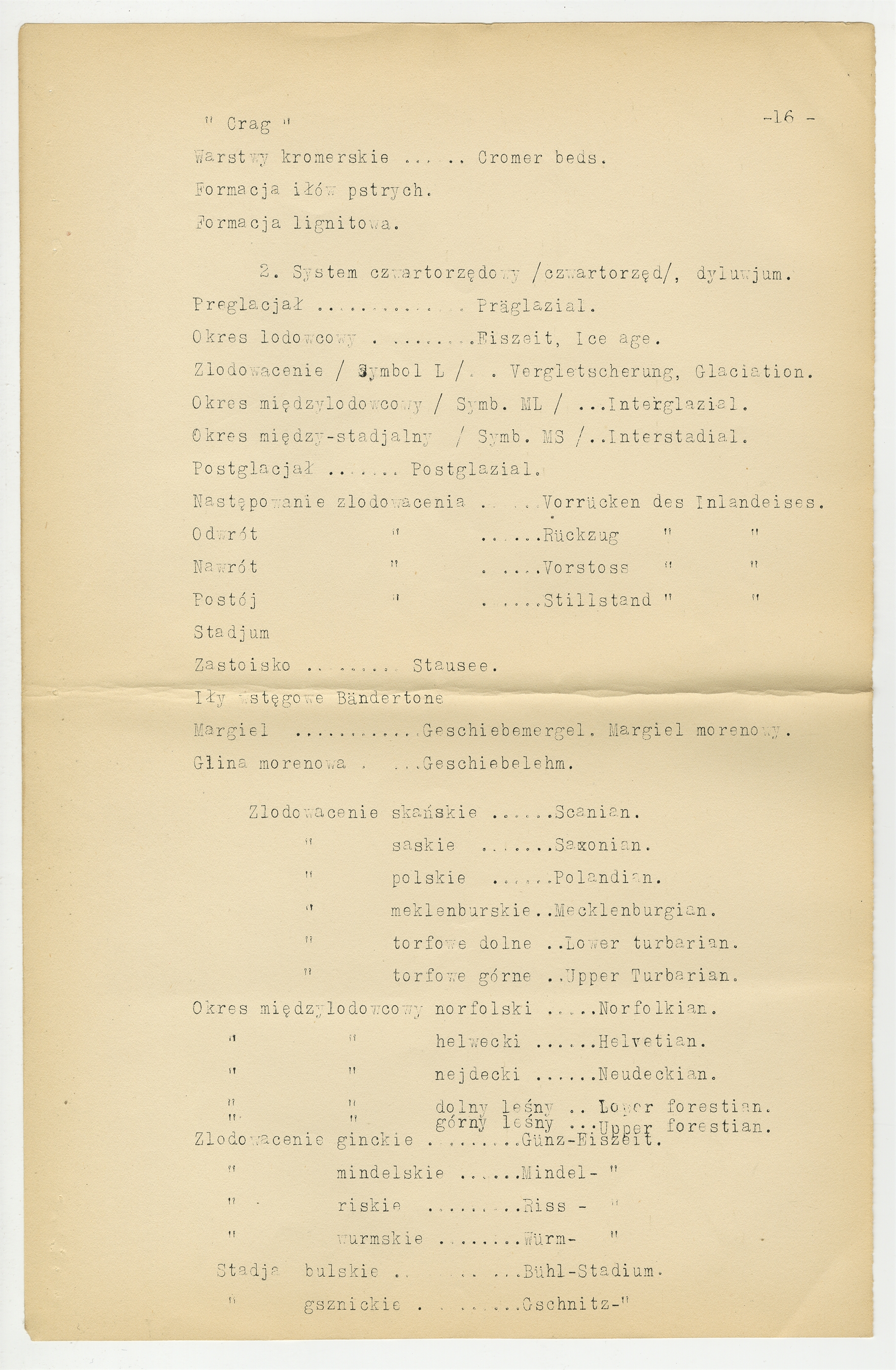 Maszynopis projektu zatytułowanego "Słownictwo Geologiczne i Paleontologiczne" przysłany do prof. Stefana Krukowskiego z Komisji do Spraw Słownictwa Geologicznego i Paleontologicznego; Rozdział: Stratygrafja (cd) - Spis terminów zasadniczych i przykładowe spolszczenie niektórych terminów lokalnych dot grupy cenozoicznej (cd)