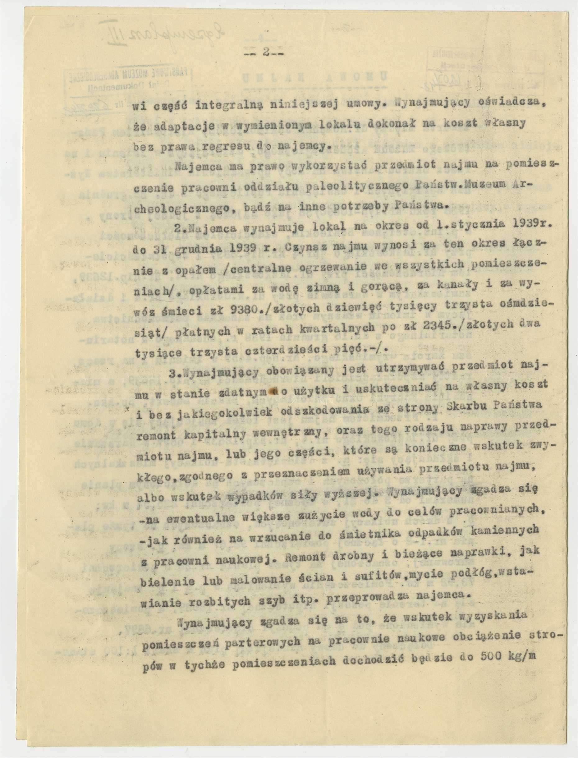 Maszynopis - umowa najmu nieruchomości przy ul. A. Idźkowskiego 4 w Warszawie zawarta pomiędzy Stefanem Bonieckim (właściciel) a Romanem Jakimowiczem kierownikiem PMA. III egzemplarz. Strona 2