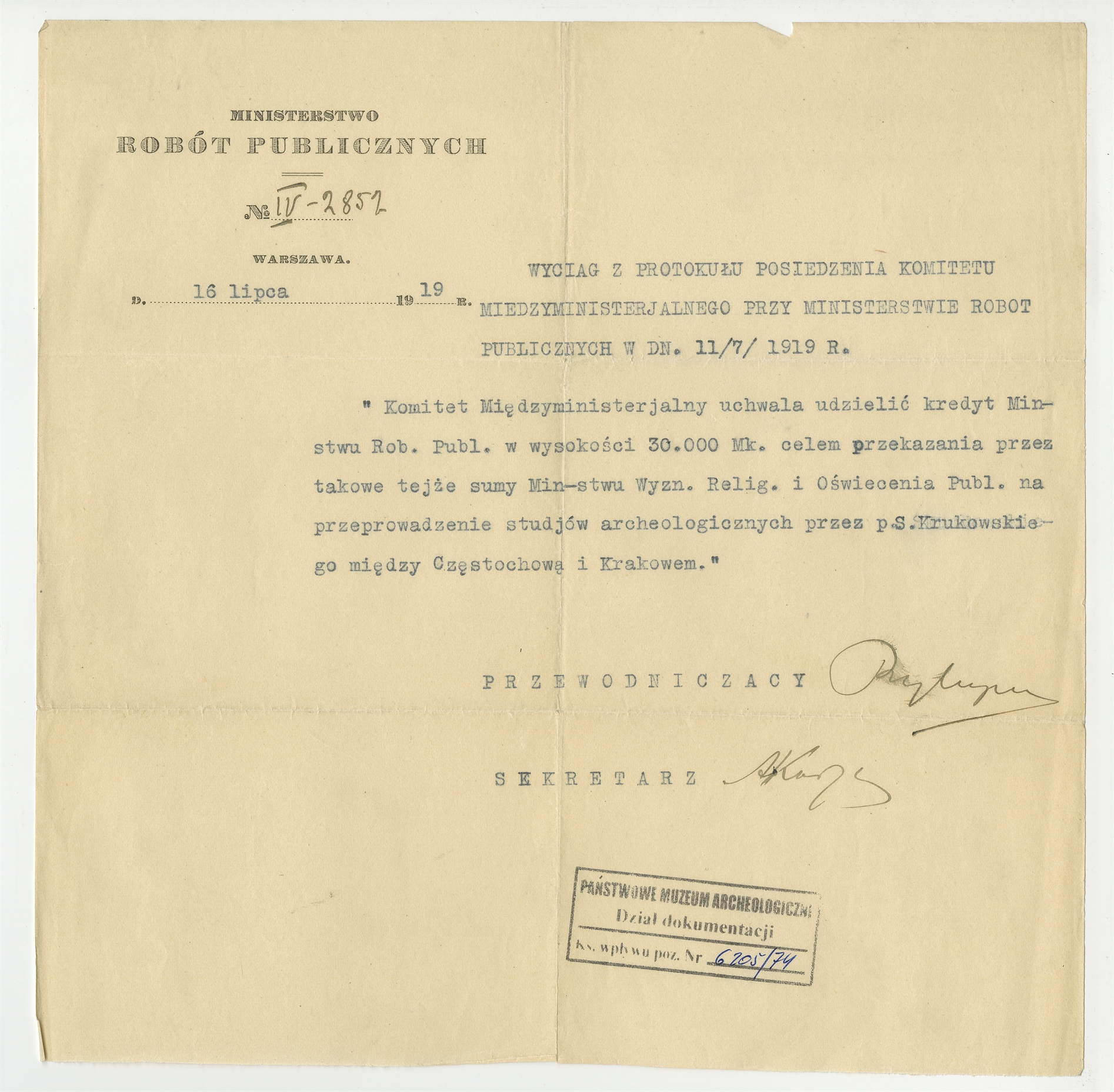 Maszynopis - wyciąg z protokołu posiedzenia międzyministerialnego przy Ministerstwie Robót Publicznych z dnia 16 lipca 1919 roku