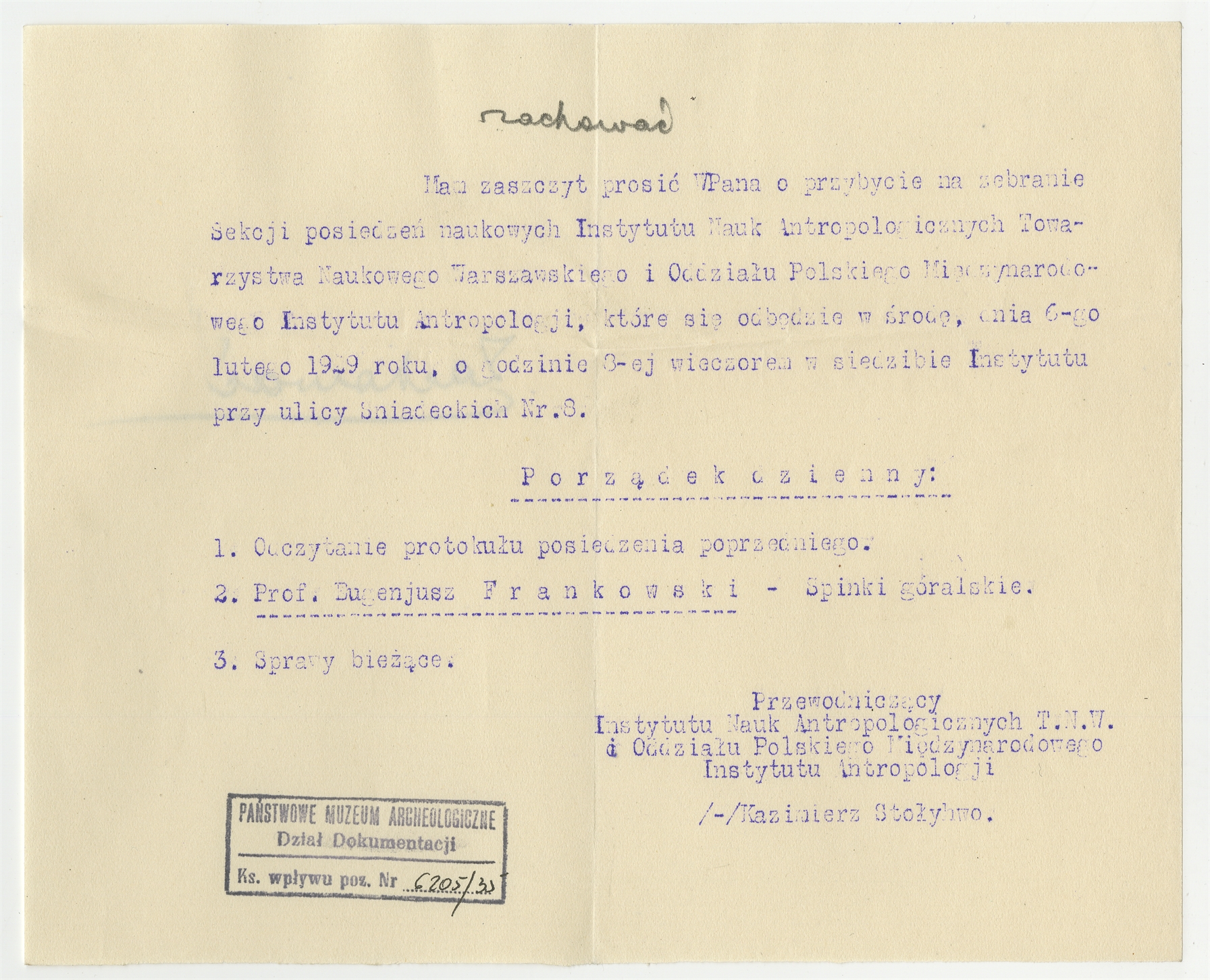 Maszynopis - Zaproszenie na posiedzenie naukowe Instytutu Nauk Antropologicznych T.N.W. w dniu 6 lutego 1929 roku