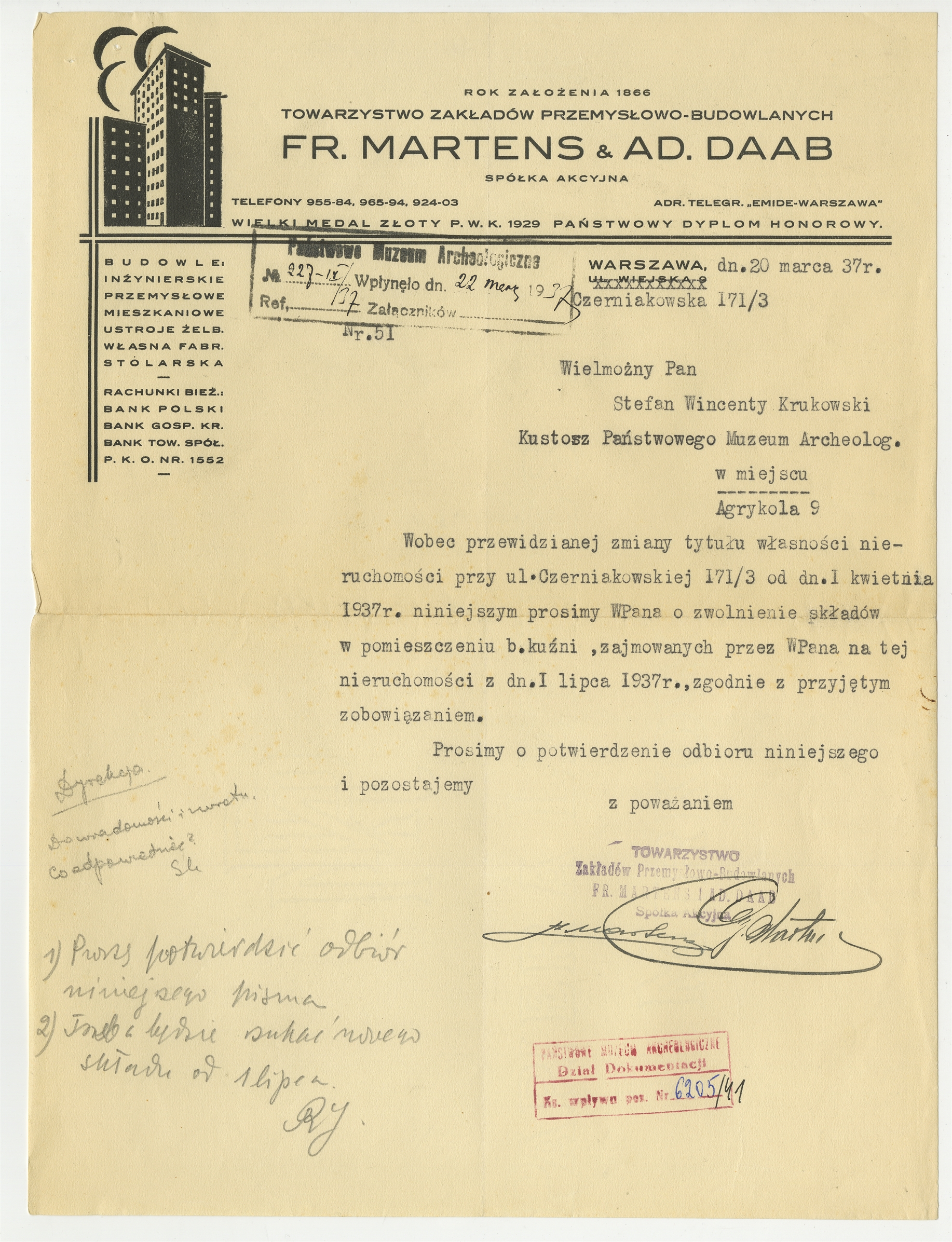 Pismo z dnia 20 marca 1937 do prof. Stefana Krukowskiego od "Towarzystwa Zakładów Przemysłowo-Budowlanych FR. Martens i AD. Daab"